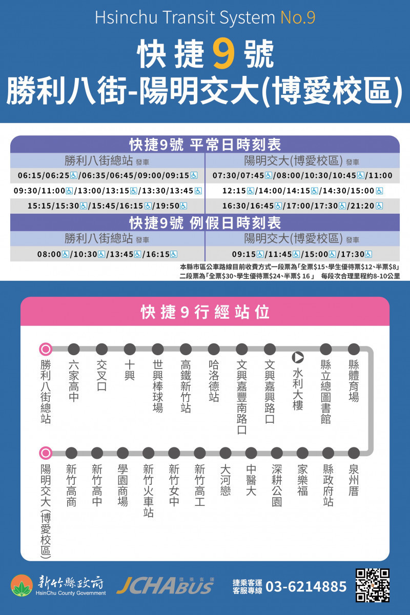 為增進大新竹生活圈往返便利性,快捷9號自115年2月1日起新增假日班表,共8班次,分別為往程(勝利八街總站發車)4班次:08:00、10:30、13:45、16:15;返程(陽明交大博愛校區發車)4班次:09:15、11:45、15:00、17:30。增班照顧假日觀光遊憩、親子出遊及學生往返新竹市區補習之需求,增進高鐵新竹站與新竹火車站之轉乘功能,以利各使用族群搭乘需求。
