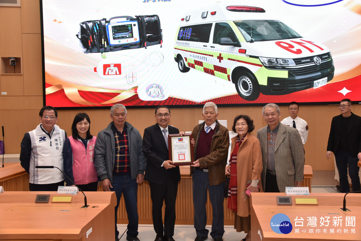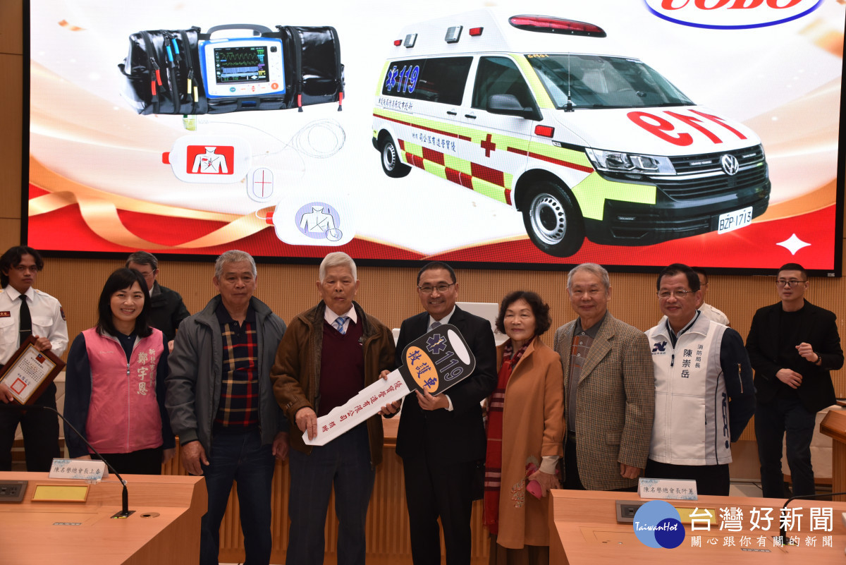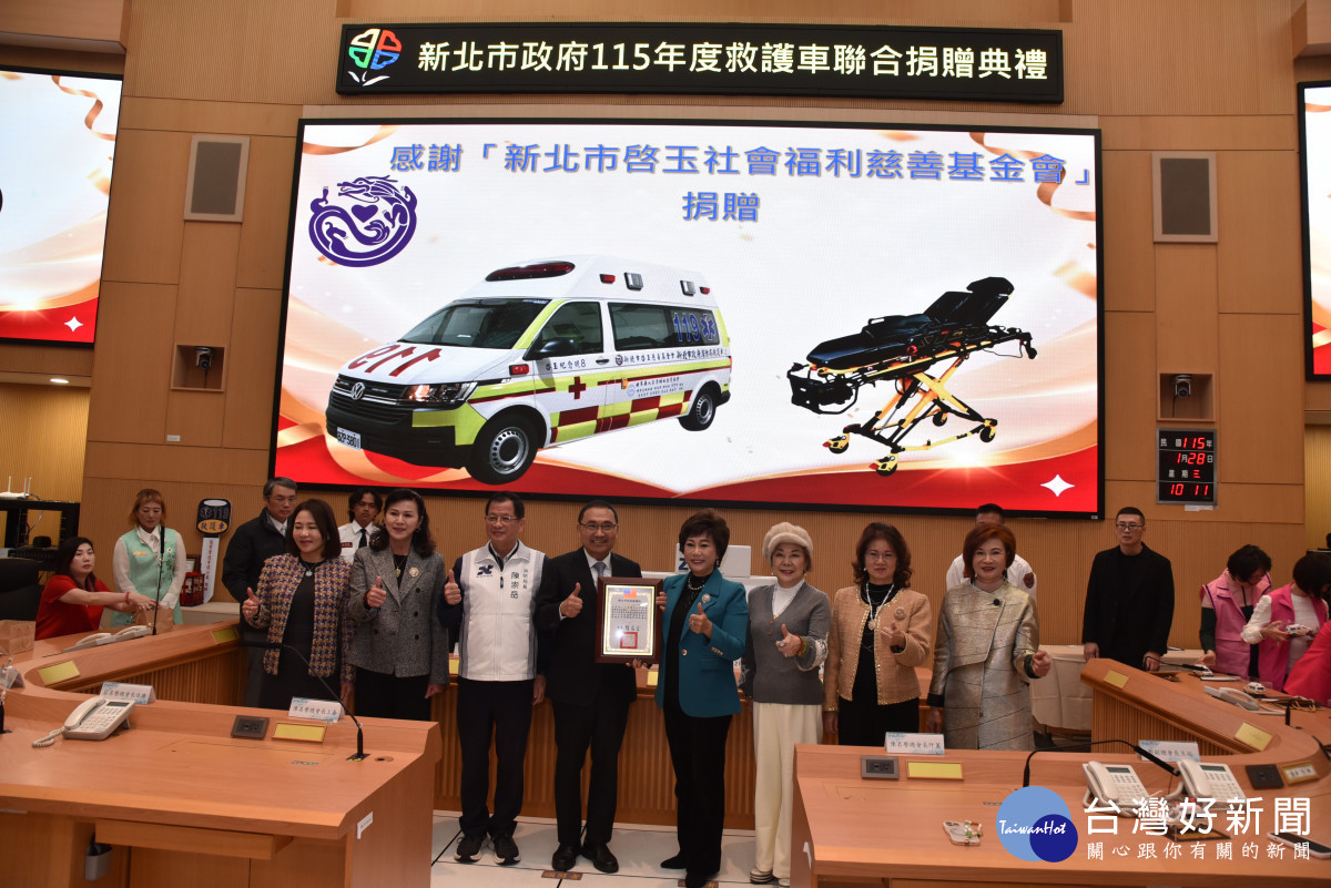 「世界華人工商婦女企管協會」及「優寶營造有限公司」今(28)日捐贈新北市政府2輛高頂救護車與各項急救器材,市長侯友宜代表受贈並回贈感謝狀,高度表彰兩單位無私奉獻的義行,以及對新北市公共安全與醫療救護量能的卓越貢獻。