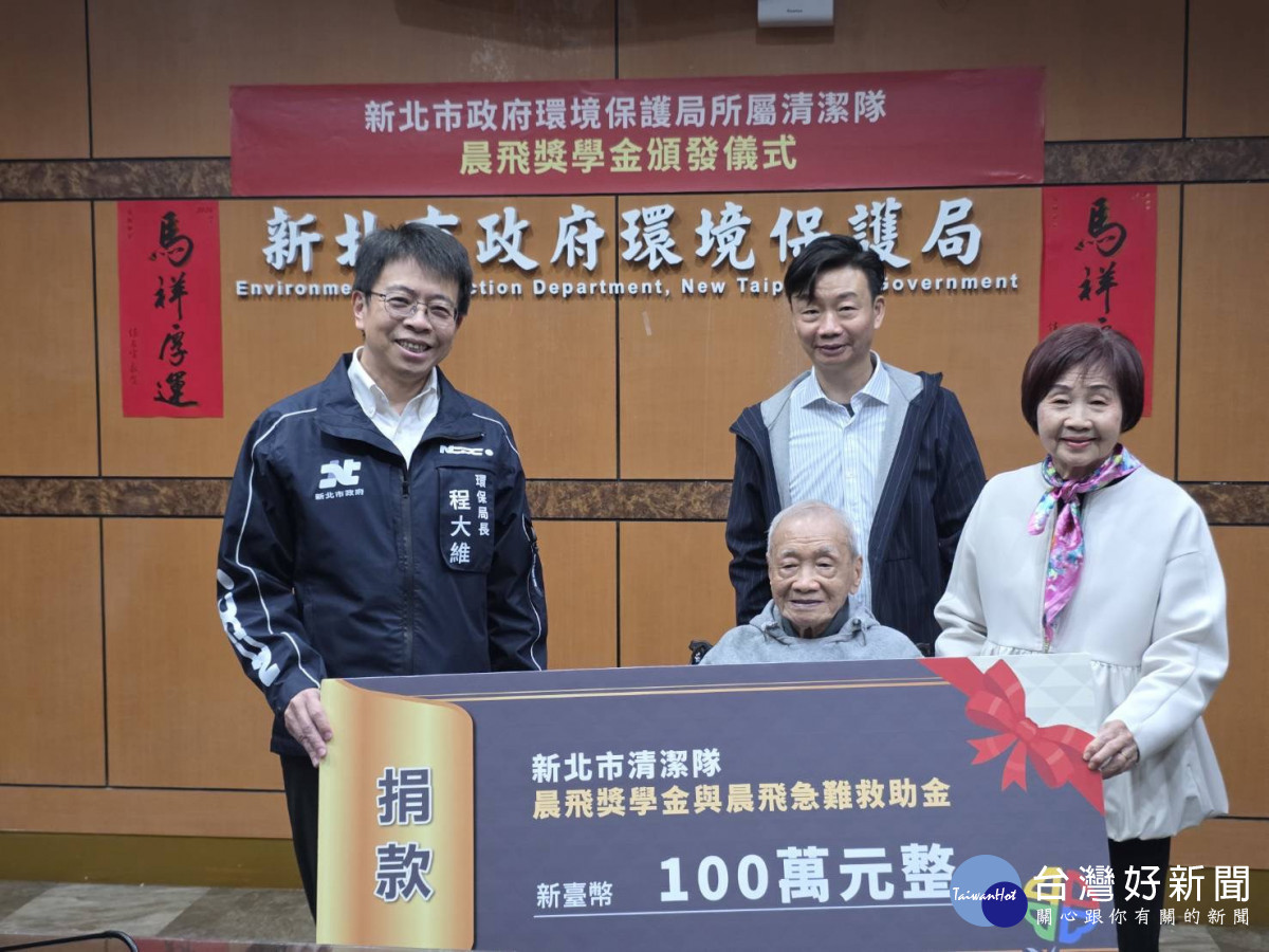 新北市環保局昨(28)日舉辦「新北市政府環境保護局所屬清潔隊晨飛獎學金及急難救助金」捐款暨頒獎儀式,感謝善心人士陳輝先生及陳念平先生慷慨捐助,以實際行動長期關懷基層清潔隊員及其家庭,展現社會溫暖與善的循環。