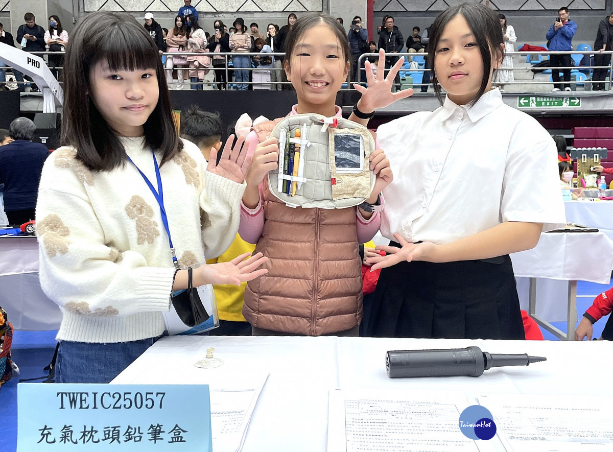 新店國小白礿霓、梁庭郡、宋芝妤同學則設計研發「充氣枕頭鉛筆盒」,讓平凡文具搖身一變成為舒適午睡枕。白礿霓同學分享,備賽過程雖充滿挑戰,卻磨練出強大抗壓性,團隊成功的秘訣在於成員間的「包容與團結」,以溫暖提醒取代責備,這是科學研究中不可或缺的團隊精神。