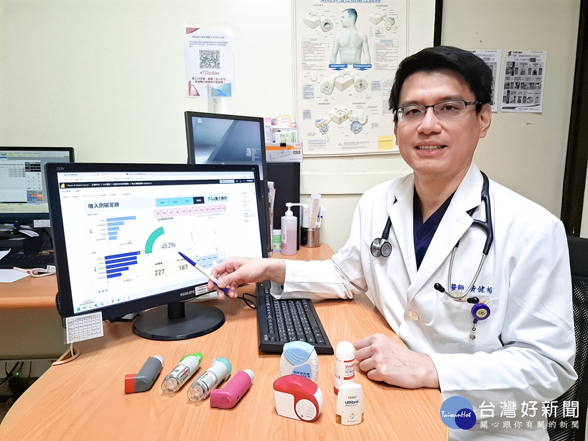 胸腔內科團隊也積極響應永續,黃健裕主任說明,相較於傳統定量噴霧吸入劑(MDI)需使用高碳排推進氣體,乾粉吸入劑(DPI)的碳足跡更低,在適當病人族群中亦能提供穩定的治療效果。因此,團隊已逐步提高乾粉吸入劑的使用比例,讓病人在接受治療時,也能為環境永續盡一份心力,實踐「愛健康也愛地球」的雙重價值。