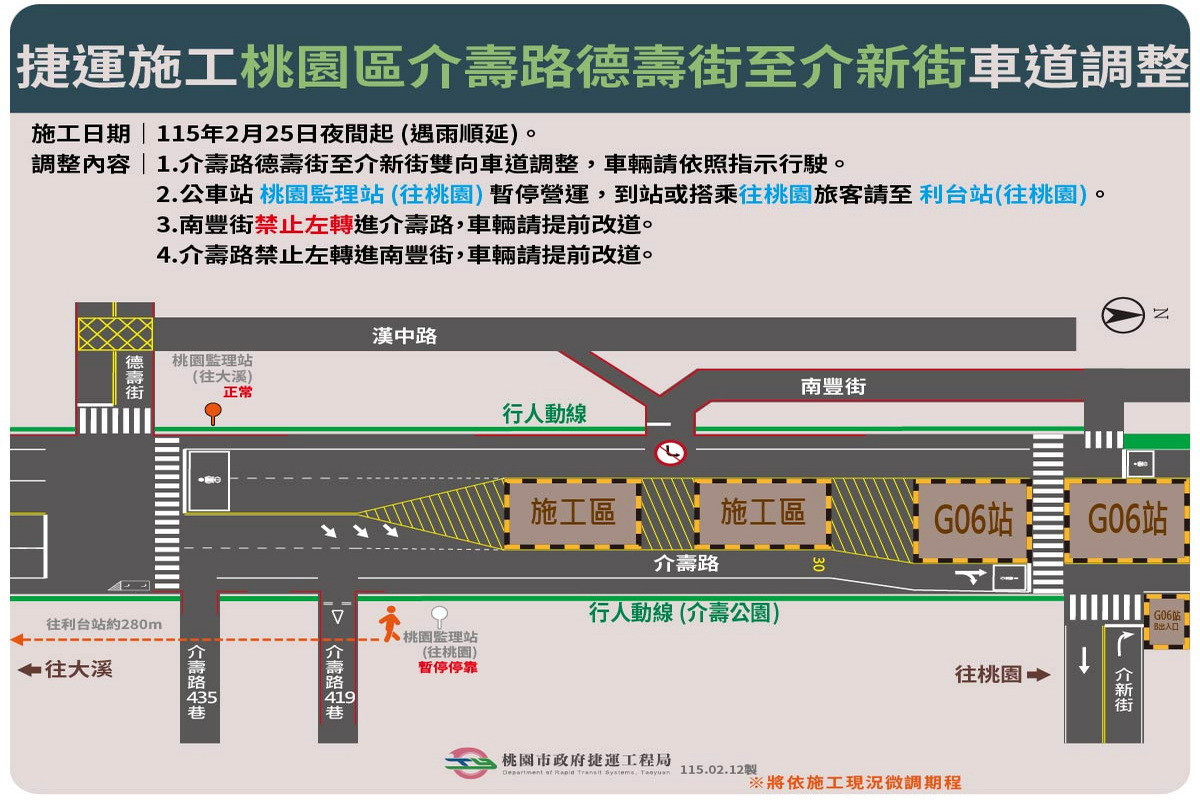 為桃園捷運綠線地下潛盾機作業所需,市府捷工局13日表示,預計於115年2月25日夜間起,進行介壽路德壽街至介新街間南北雙向道路線形及施工圍籬等交通維持措施調整,提醒民眾行經本路段注意交通動線的改變並遵循相關標誌、標線降低車速小心駕駛。