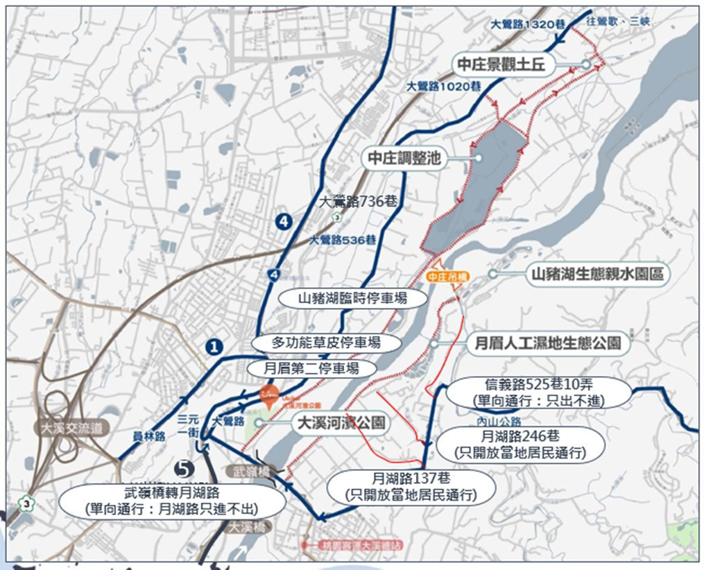 交通管制期間由115/01/10至115/2/22的假日期間,月湖路將採單向通行(由武嶺橋進、信義路525巷出),部分巷道僅供當地居民通行或封閉管制。
