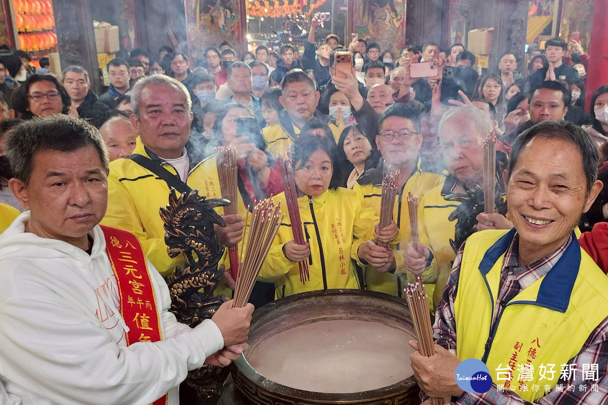 有八德大廟之稱的市定古蹟八德三元宮,於大年初一(2/17)清晨1時15分隆重舉辦「丙午新春開廟門暨集體頭香祈福儀式」,由主任委員呂林小鳳率領全體管理委員,與來自各方數百位信眾齊聚參與,共同向主祀的三官大帝及廟內諸神明虔誠上香,祈求新春平安順遂、福運綿延。