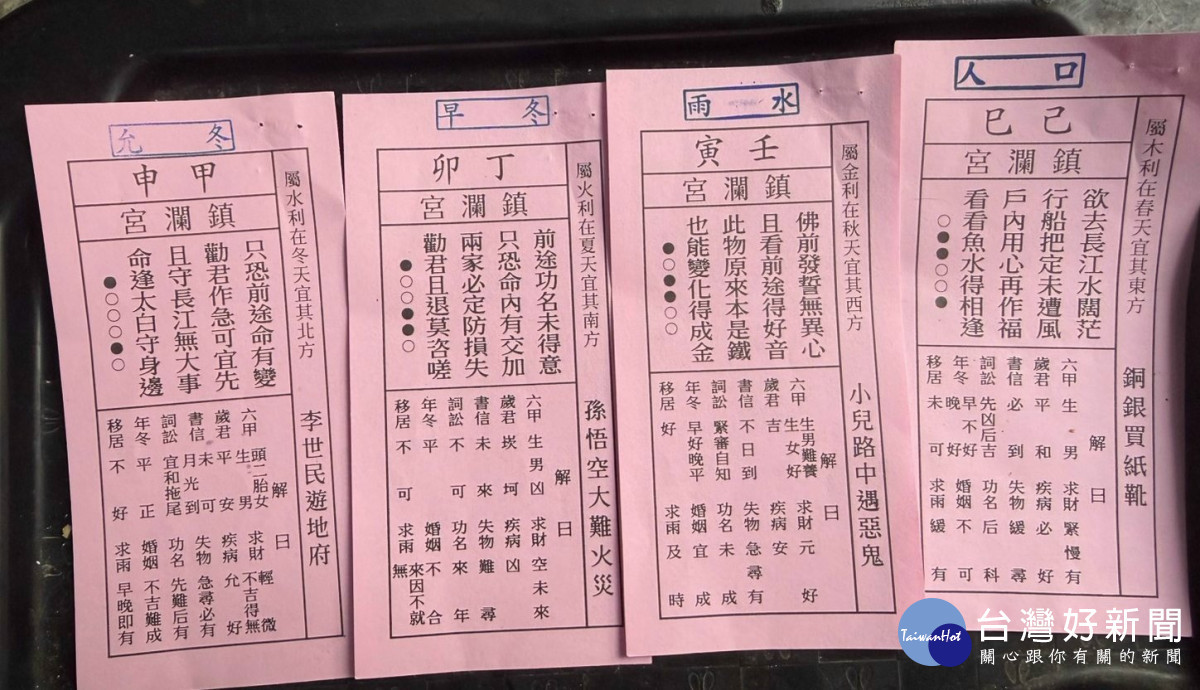 台中大甲鎮瀾宮大年初四迎神,今(20)日求出今年媽祖啟示國運公韱「又稱四季籤」,廟方表示今年媽祖啟示是中上韱,要求國人團結渡困境,不過有解韱人士卻說媽祖的啟示運勢讓人有點感到不妙,目前廟方將四張籤詩供信眾取閱參考,吸引眾多信徒索取,至於好壞各有解讀。