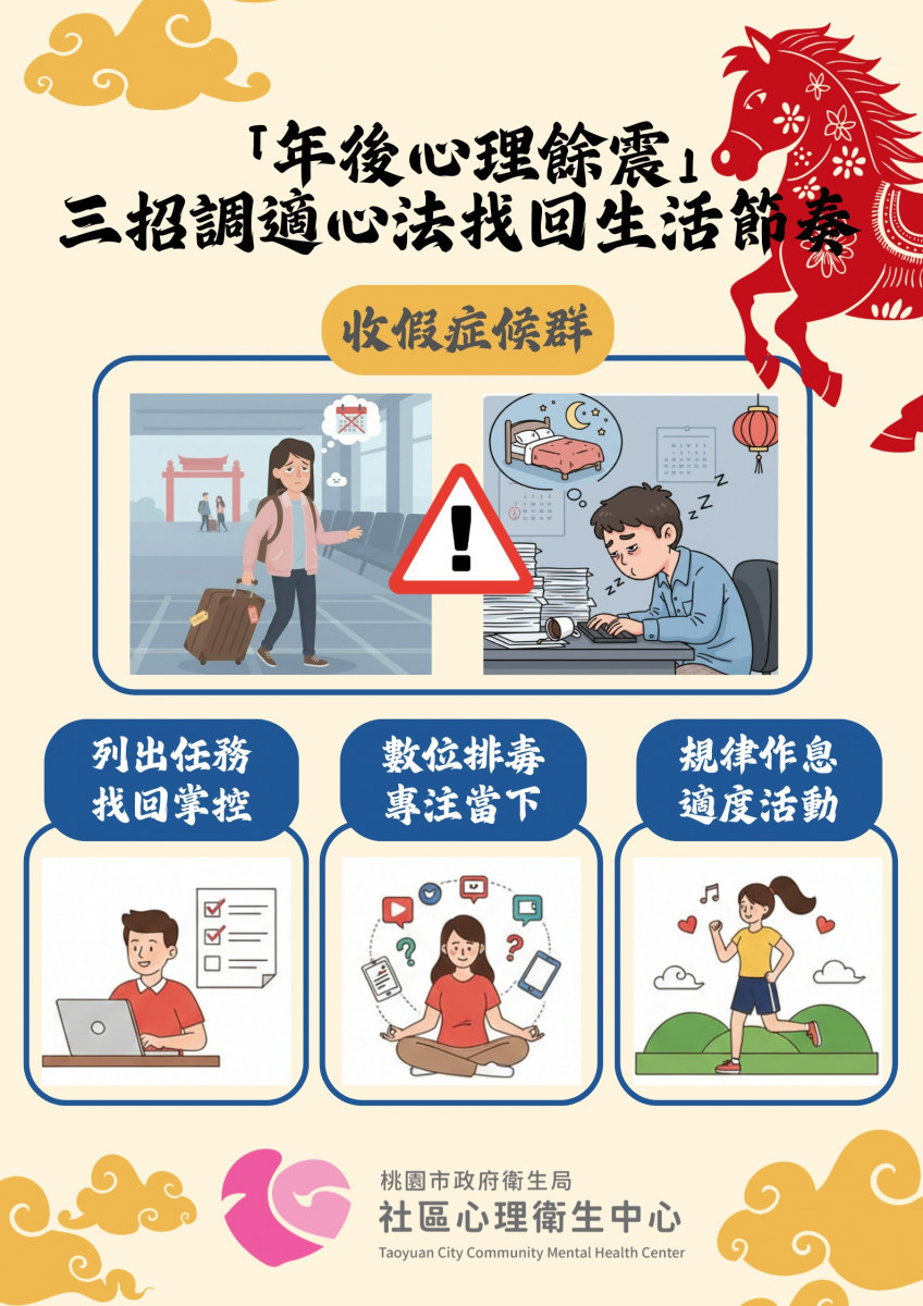 隨著春節連假結束,許多民眾重返職場或校園,卻發現自己出現注意力不集中、莫名疲累,甚至焦慮與失落感。桃園市政府衛生局提醒,這可能是身心在經歷較大生活轉換時常見的「心理餘震」,屬於正常適應反應,不必過度擔心。