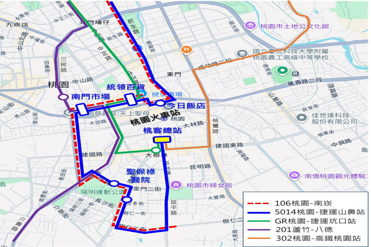 交通局說明,目前桃園後站往返桃園前站至蘆竹南崁方向原有106、GR、201及302等4條公車路線提供服務。106路線停駛後,將由5014主支線路線銜接替代,其中5014主線【桃園-捷運山鼻站】已進行營運調整,將起站由「今日飯店」延伸調整為「桃客總站」作為端點站,使路線服務範圍更完整。