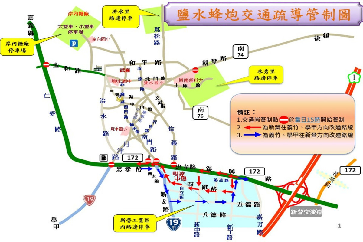 新營警分局表示,因應鹽水蜂炮期間,172線新營交流道復興路至鹽水仁愛路段會有車潮湧入,恐造成交通壅塞情形,該分局3月3日15時起至活動結束止,實施交通疏導管制措施。行駛於172線、台19線車輛進入鹽水市區管制地點如下:忠孝路、信義路口。忠孝路、南門路口。忠孝路、南太路口。忠孝路、月津路口。仁愛路、金和路口。朝琴路、和平路口。