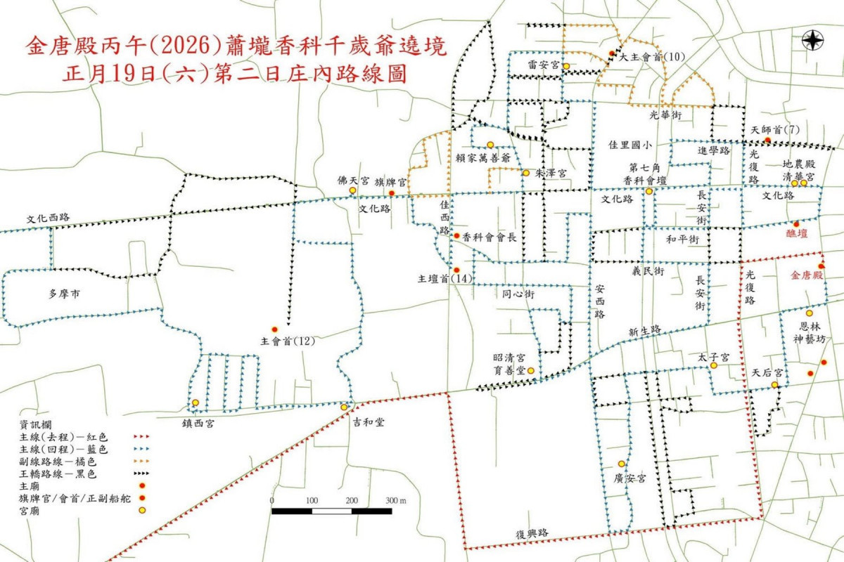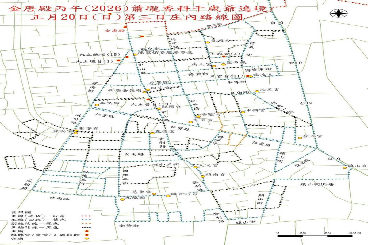 佳里區金唐殿香科醮典俗稱蕭壠香,為台南市定民俗活動、名列南瀛五大香。2026年丙午年香科將於3月6日至8日,舉辦千歲爺及百足真人蜈蚣陣遶境活動。佳里警察分局表示,為維護活動安全及道路交通順暢,將依香陣行經過程和路線實施交通管制,建議用路人避開遶境路線,盡量改行替代道路。