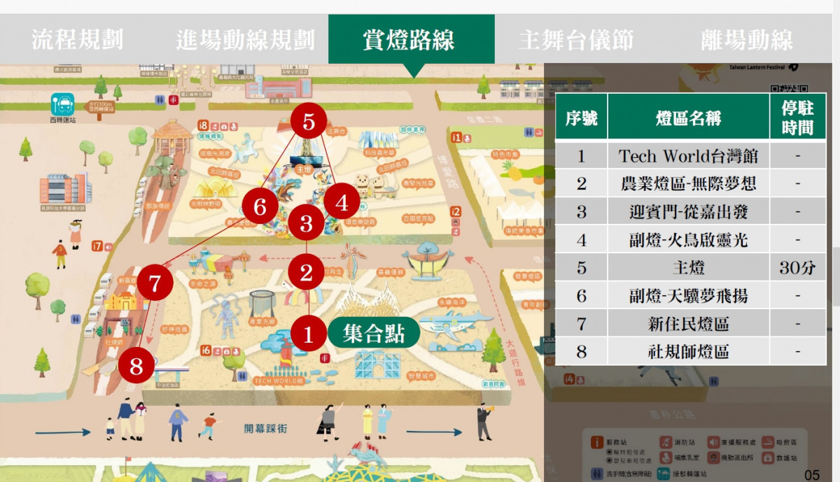 縣府指出,媽祖將於下午4時45分自TECH WORLD館前集合出發,沿途停留農業燈區與主燈區,並在主燈區為民眾祈福,祝願大家心願成真。隨後將走入新住民燈區及社規師燈區,陪伴民眾漫步燈區,共同體驗燈會的熱鬧氛圍。