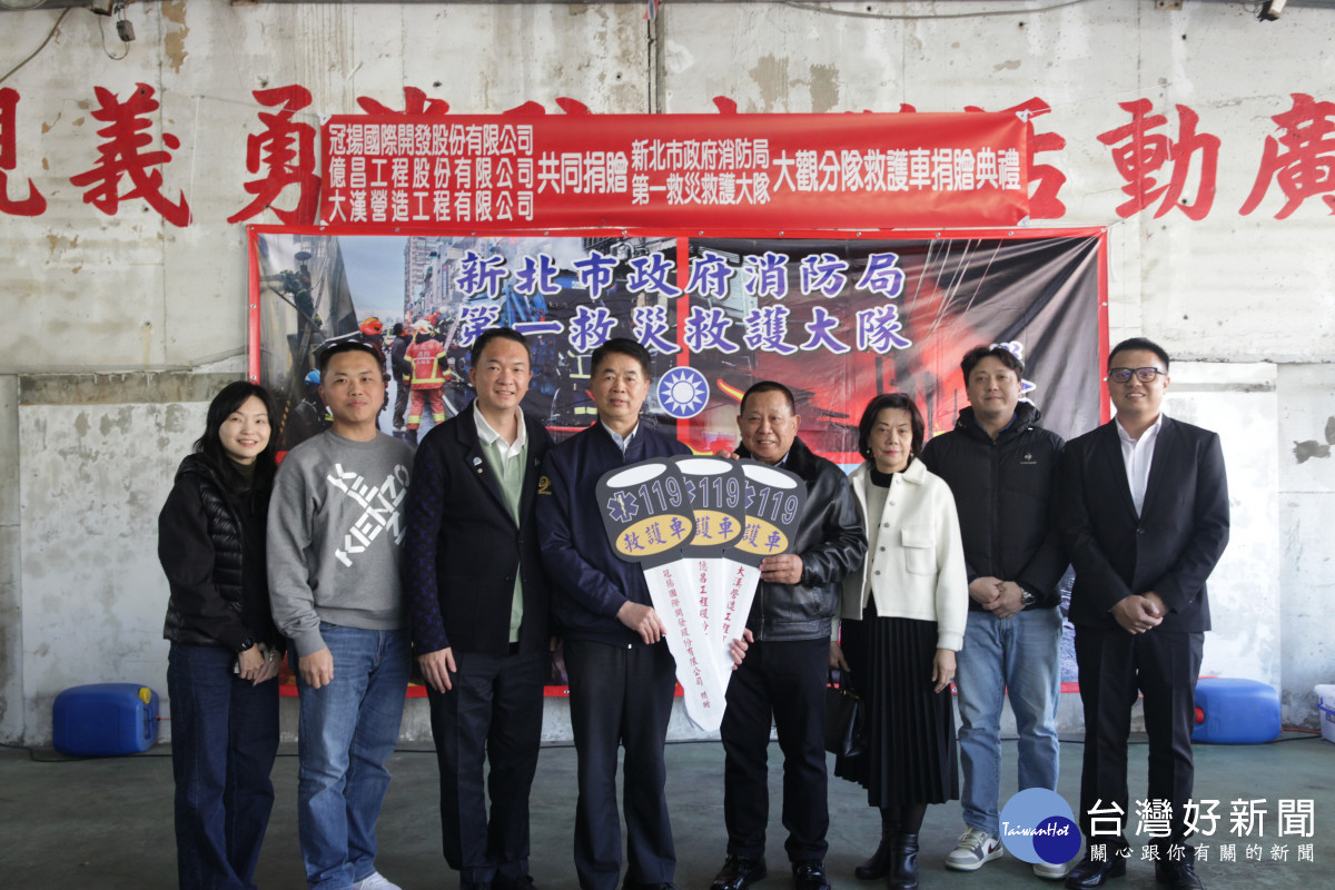 新北市政府消防局今( 13)日於大觀分隊舉行救護車捐贈儀式,冠揚國際執行長賴金龍與勝輝地產副董事長何易學共同捐贈「大觀91高頂救護車」,為第一線消防救護工作再添生力軍。消防局表示,將有效提升板橋地區緊急救護能量,為市民提供更即時、完善的生命守護。