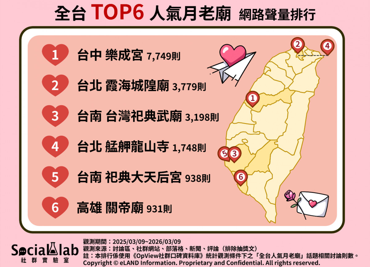 每逢情人節或想脫單時,「拜月老」總成為社群熱議焦點。無論是渴望邂逅正緣,還是祈求感情穩定,信眾都期盼神助攻。本次《Social Lab社群實驗室》透過《OpView社群口碑資料庫》,追蹤近一年關於「月老廟」的網路聲量,揭開網友心目中最靈驗的姻緣聖地。