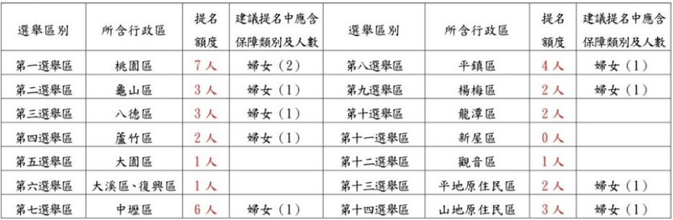 國民黨桃園市議員各選舉區提名席次如下: