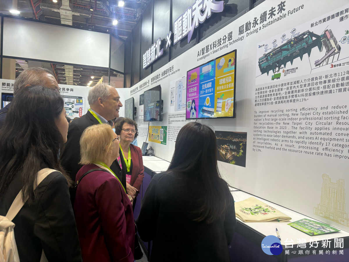 新北市環保局以「新北AI智慧分選廠打造永續城市」榮獲「2026智慧城市創新應用獎」,3月17至20日於臺北市南港展覽館二館參與「2026智慧城市展暨淨零城市展」,並分享在智慧資收及循環經濟上的推動成果。今(19)日新北市資源循環教育基地更迎來吐瓦魯、美國、澳洲、斯洛伐克等11國外賓,實地參訪智慧回收新科技。