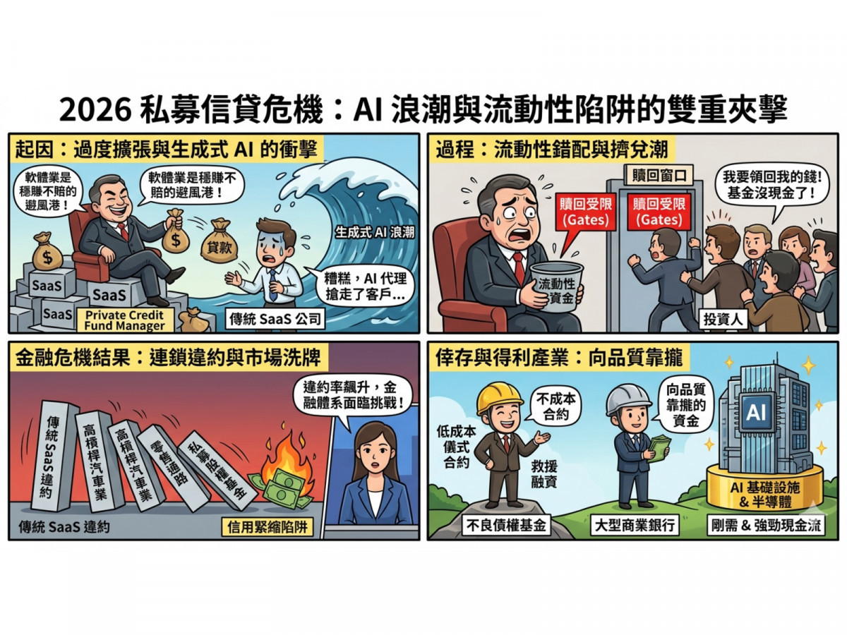 市場分析師指出,這場危機雖然不至於引發 2008 年式的系統性海嘯,但「影子銀行」的收縮將直接衝擊中小企業。特別是在高度依賴精準資本支出的半導體設備AI 供應鏈領域,資金將加速向具備高技術壁壘的「質優企業」集中,而缺乏獲利能力的企業將在這一輪信用緊縮中被徹底洗牌。