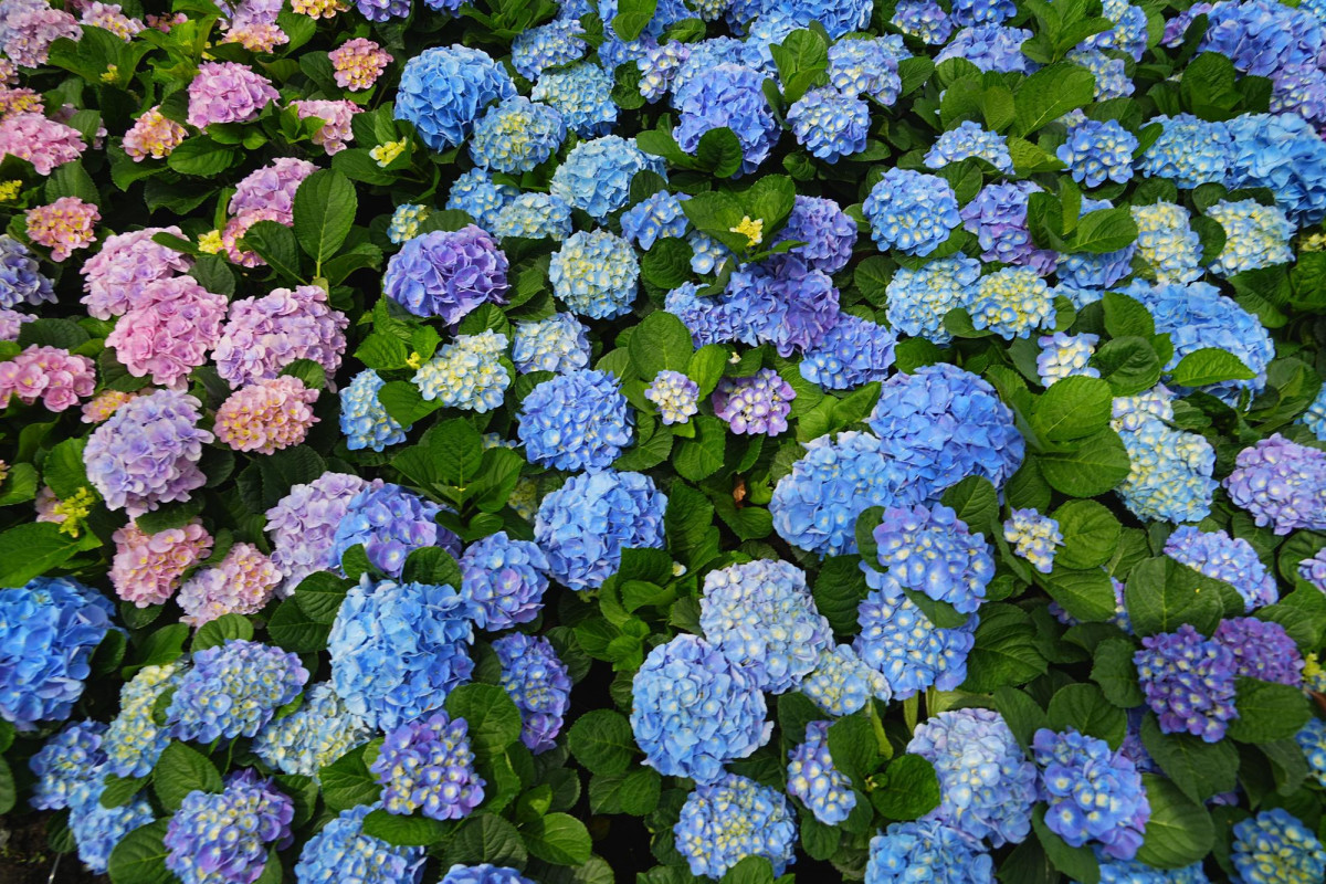 繽紛繡球花: 集結紅、粉、藍、紫、白等色彩,與成人高度的平戶杜鵑相互輝映。