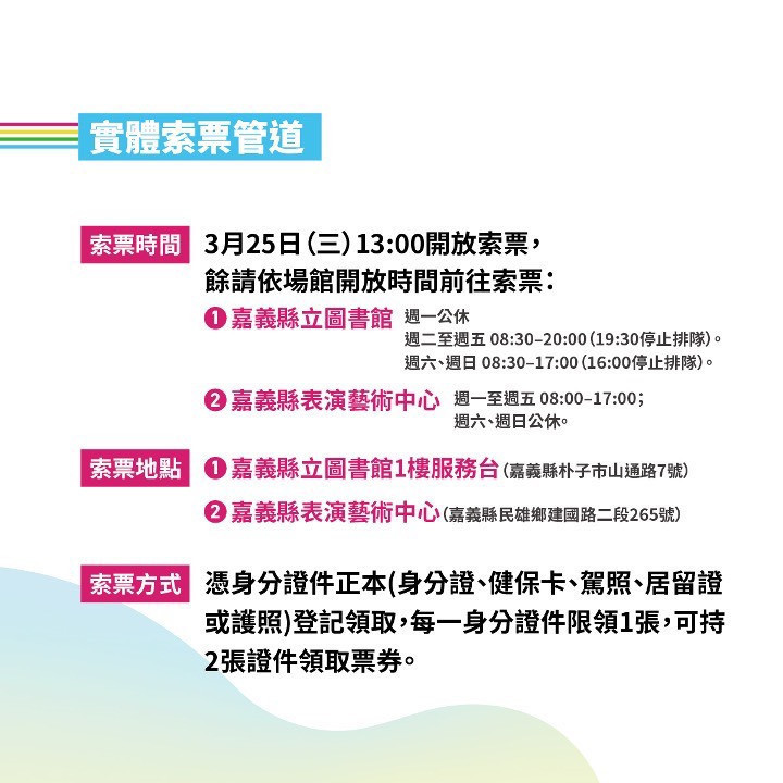 同日下午1時開放實體索票,地點為嘉義縣立圖書館1樓服務台(嘉義縣朴子市山通路7號)及嘉義縣表演藝術中心(嘉義縣民雄鄉建國路二段265號),民眾持身分證明文件登記領取,每證件限領1張。票券數量有限,4月18日當日也將開放少量候補名額供無票民眾排隊入場。
