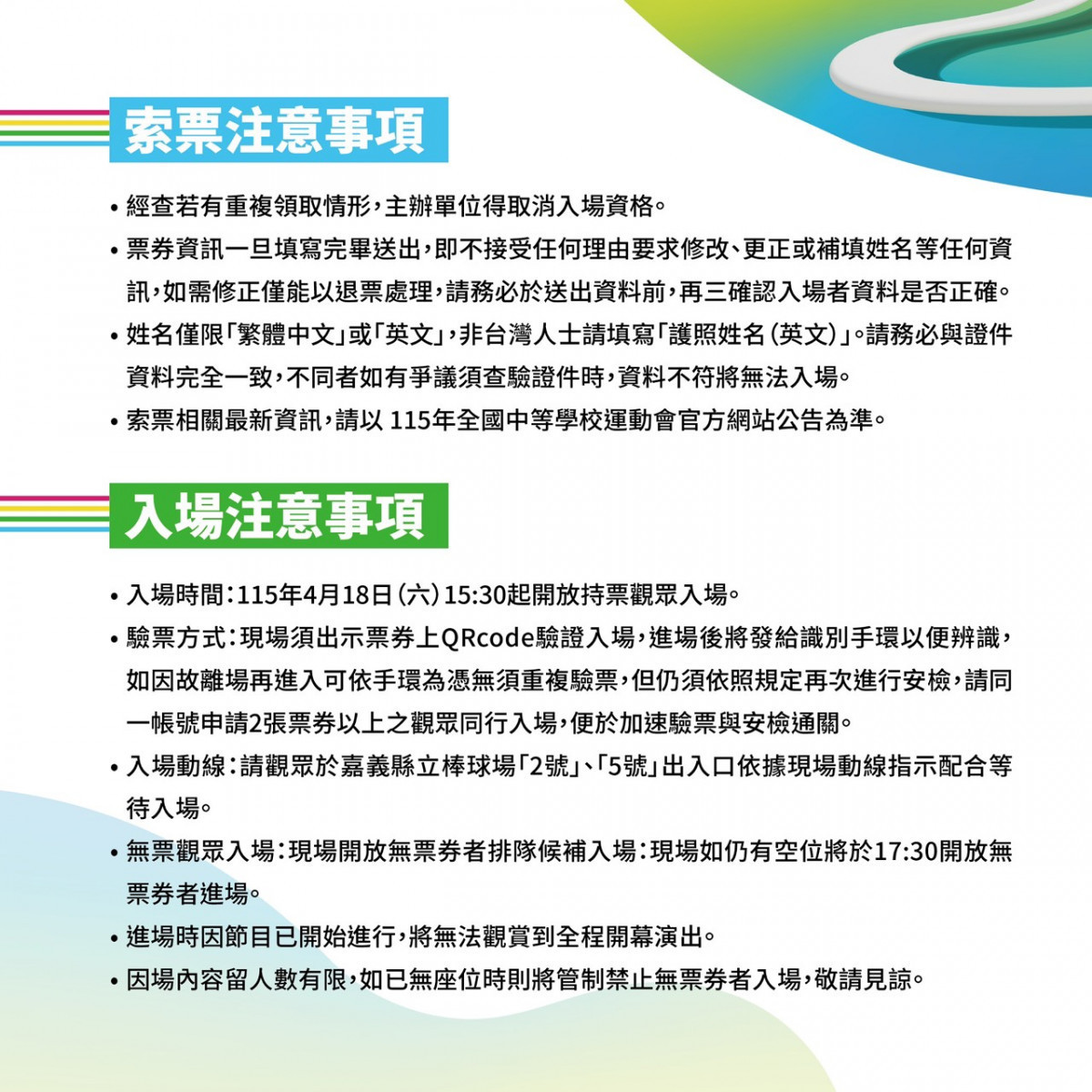 嘉義縣府指出,本屆全中運以「115全中運 超越在嘉義」為主軸,整合中央資源與地方特色,為全國中學生打造最高規格的競技舞台,賽事設21個競賽項目,有約2萬名選手與隊職員參加。開幕典禮4月18日晚間在嘉義縣立棒球場舉行,運動部與嘉義縣府精心規劃融合地方人文與運動精神節目,向全國展現嘉義縣的城市活力與台灣體育的蓬勃發展。