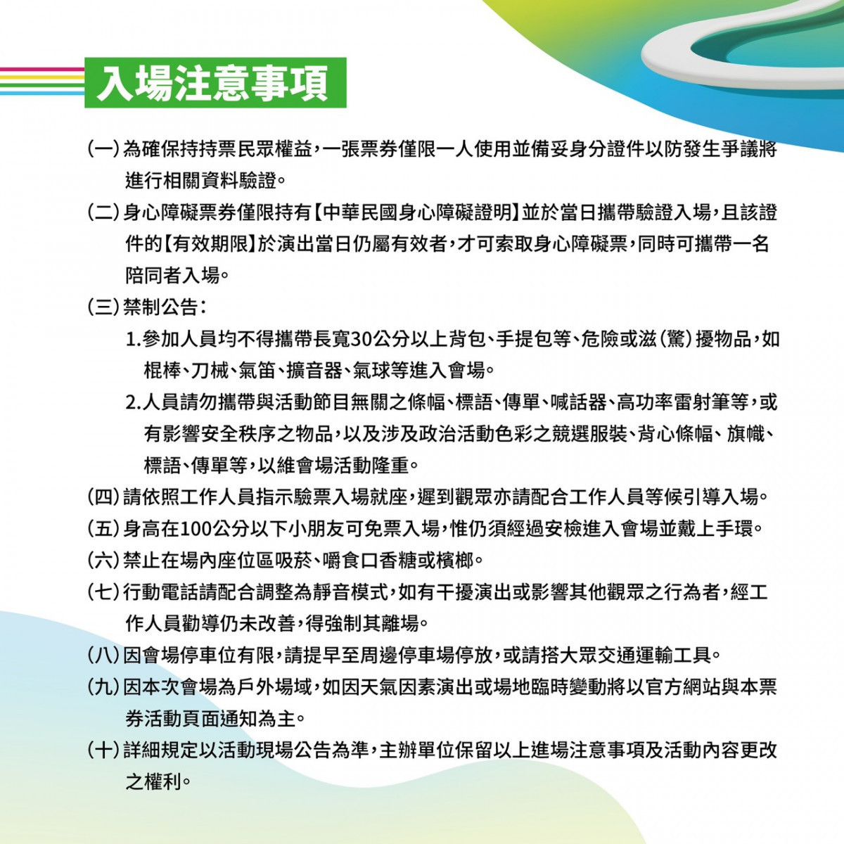 開幕典禮入場券3月25日開放索取,採線上及實體兩種方式。當日上午11時開放線上索票,民眾可透過Accupass系統索取,每組身分證或居留證號可領取2張,身高100公分以下兒童可免票入場。
