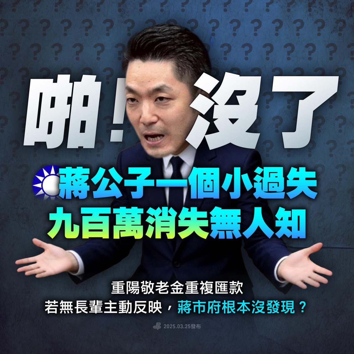 民進黨表示,去年九月台北市發放重陽敬老金,多種領取方式、58萬名長者的領取作業規模,顯然已經超過蔣市府的能力負荷。直到今年一月,「廠商」在處理匯款作業時,「不小心忘了」把已領過的人勾選掉,於是「5,000多筆」、「總計900多萬元」,就這樣匯入已經領過的長輩們戶頭。