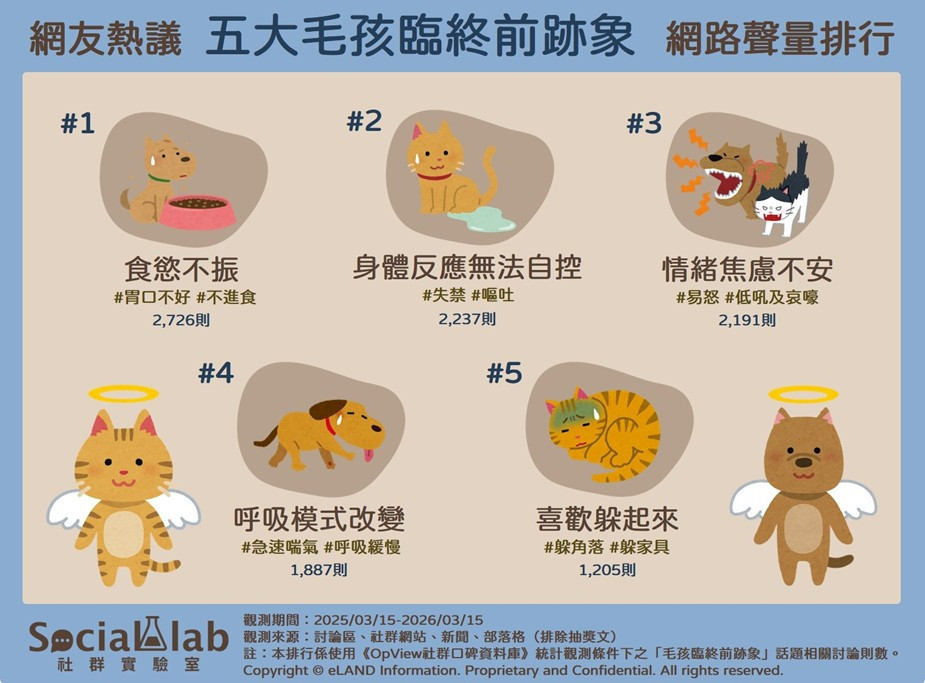 對許多飼主而言,毛孩是生命中無可取代的家人。當生命走向盡頭,毛孩雖無法言語,卻會透過細微的身體與行為變化傳遞訊號。《Social Lab社群實驗室》本次透過《OpView社群口碑資料庫》,追蹤近一年關於「毛孩臨終前跡象」的熱門話題,整理出五大網友熱議的徵兆,幫助飼主及早覺察,在最後時刻給予最貼心的守護。