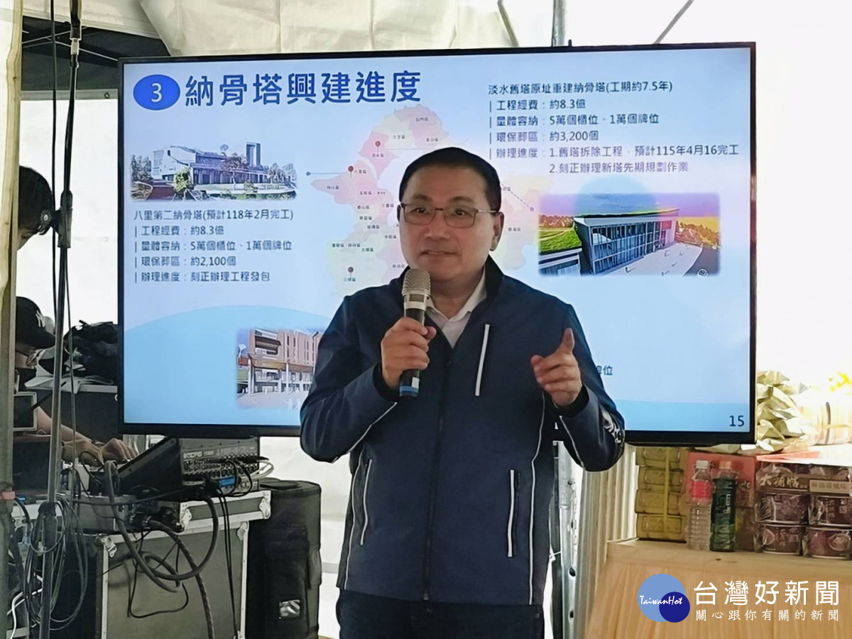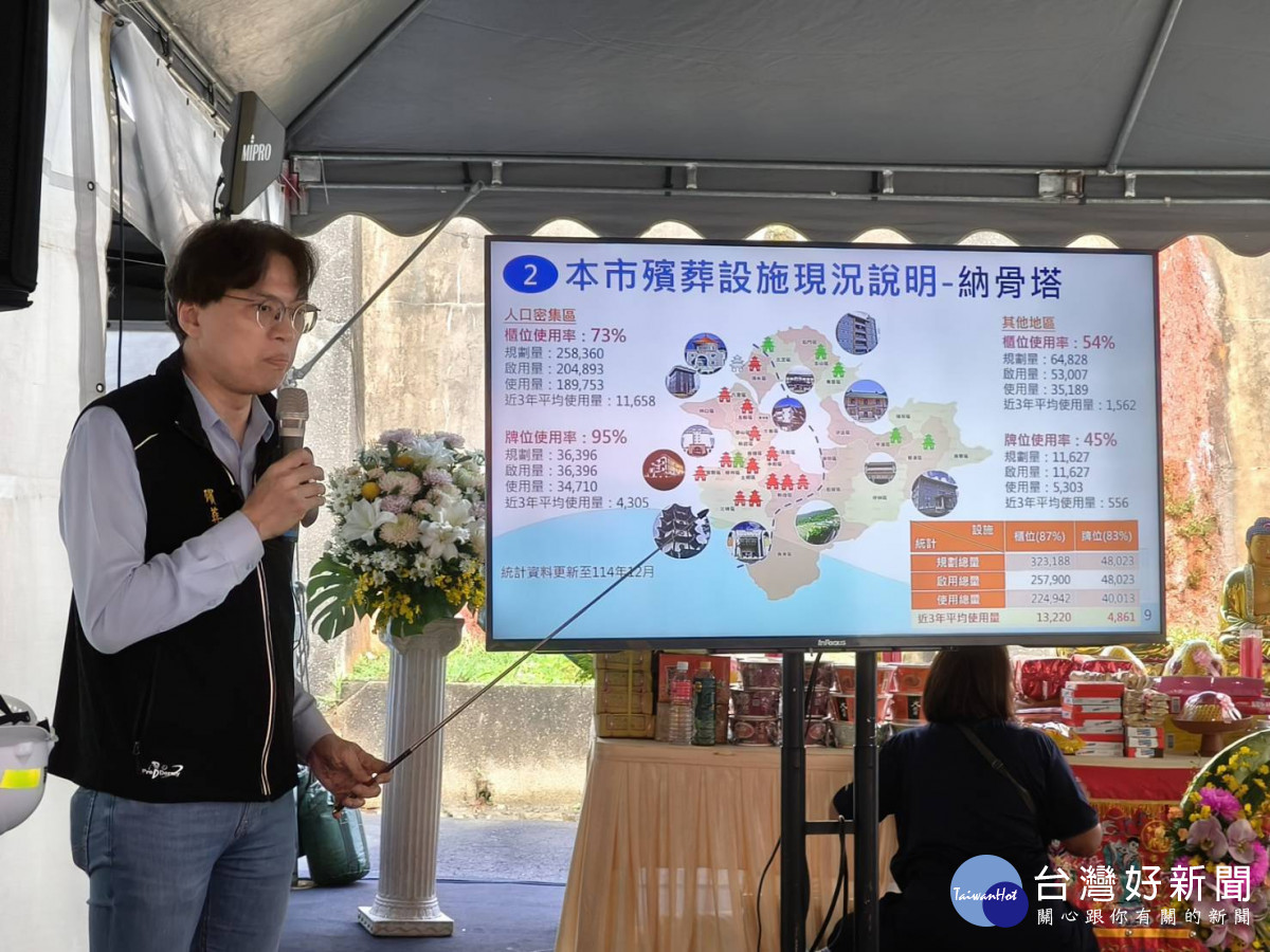 林耀長說,新北市近3年納骨櫃位平均每年使用量約1萬3,200個、祖先牌位約4,800個。為滿足民眾安奉及祭祀需求,市府積極盤點既有空間增設櫃位,並推動鶯歌、八里、淡水、五股及林口等5處納骨塔及環保葬區新建工程,預計於 117年起陸續完工後,可再提供約25萬4,100個櫃位及5.2萬個牌位。