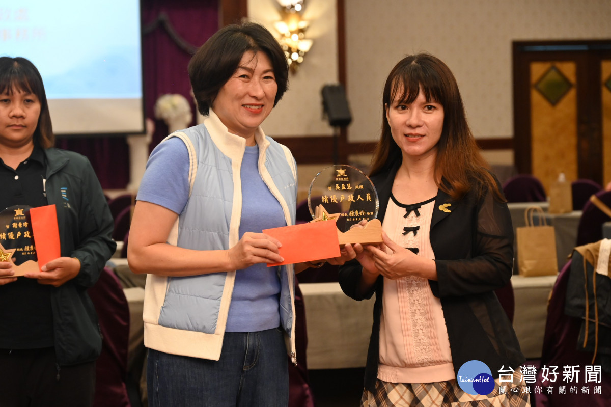 饒慶鈴並逐一頒獎給績優戶政人員,包括臺東戶政事務所課員王惠英、謝素珍及成功戶政事務所代理主任吳盈慧、關山戶政事務所課員林玫伶、 太麻里戶政事務所課員吳昆益、縣府民政處戶政科科員蘇靖偉。