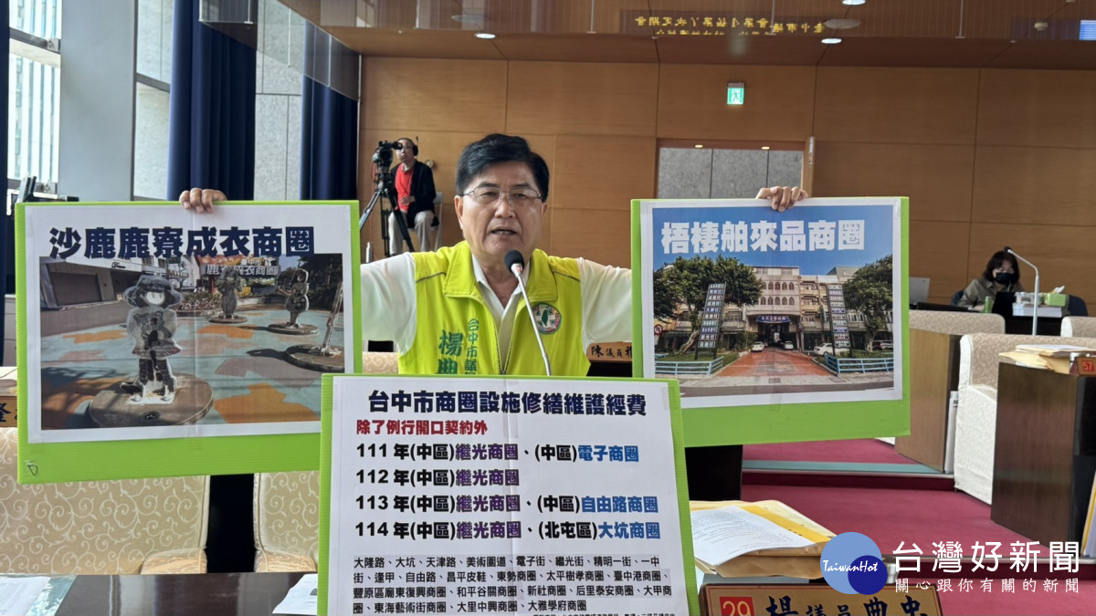 楊典忠指出,市府每年編列約220萬元商圈設施設備養護費用,但從111年至114年間,商圈臨時設備損壞僅有4個商圈獲得修繕經費,其中3個集中在中區,1個位於北屯區,其餘20個商圈完全未受惠,令人質疑資源分配是否合理,他以海線商圈為例,梧棲舶來品商圈長期缺乏設施更新,地方多次反映卻未見市府積極回應,沙鹿鹿寮商圈入口意象設施,歷經多年風吹日曬,早已出現褪色、生鏽等情況,年久失修卻始終未獲修繕經費支持。