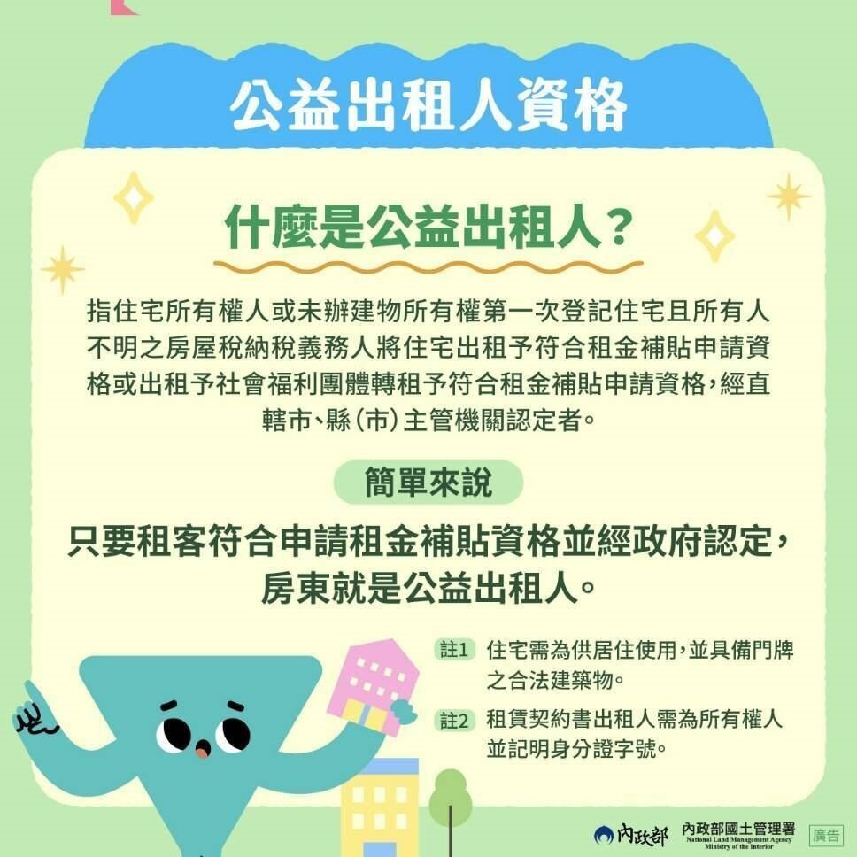都發局說,公益出租人認定,各縣市政府於租金補貼申請案審查完畢後皆會提供公益出租人名冊等資料予國稅及地方稅稽徵機關,故建議房東無須再額外提出申請。