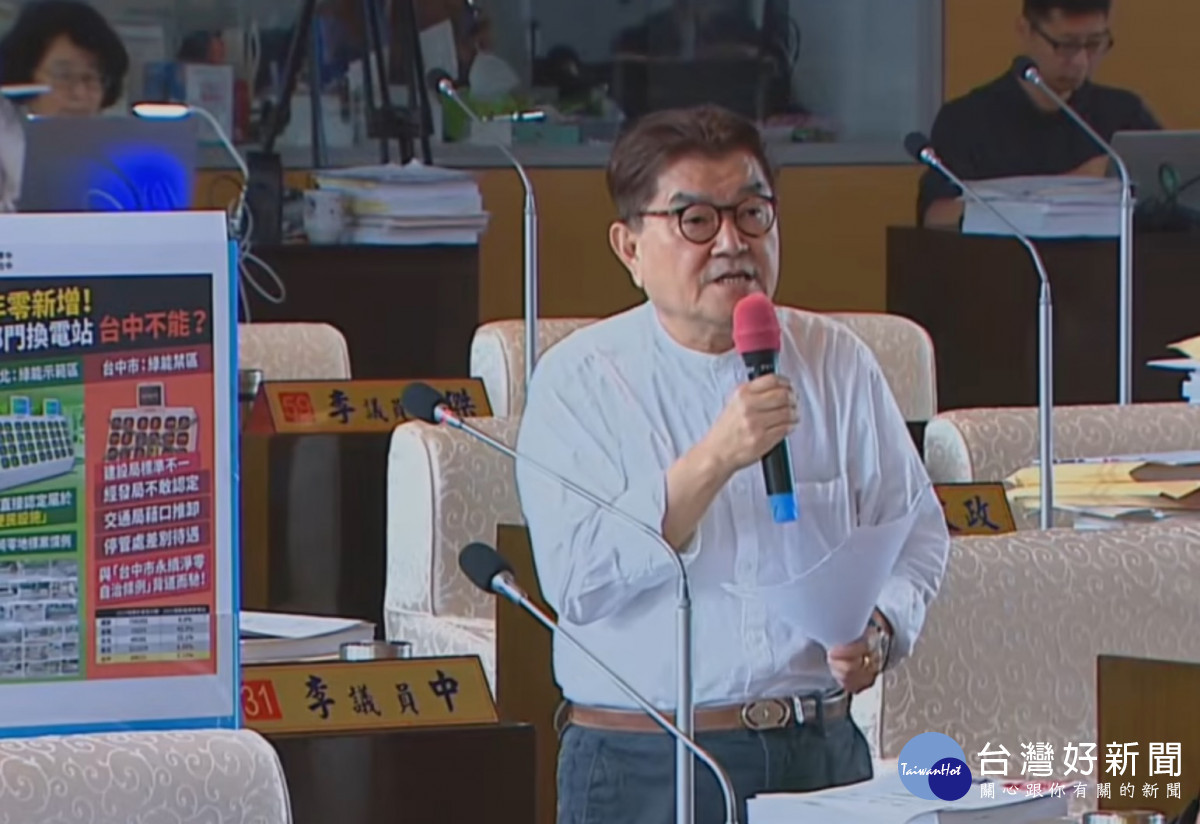 李中強調,目前台中市公有土地設置換電站者共70處,且已經6年零成長,他問了經發局、交通局及建設局,但各局處互推。電池交換站屬於簡易的便民服務設施,台中市因設有市有公用不動產收益原則、市有公用財產無償提供使用原則等規範,在提供使用時容易談不攏,建議另訂一套辦法提供公有土地使用。