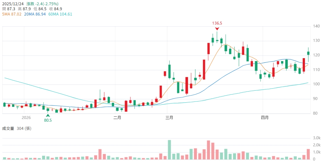 操作觀察底部出現打底放量,獲利將持續成長,股價出現止跌回穩,重回所有短期均線,震盪整理後仍有望走出第二段行情挑戰重回150元大關。