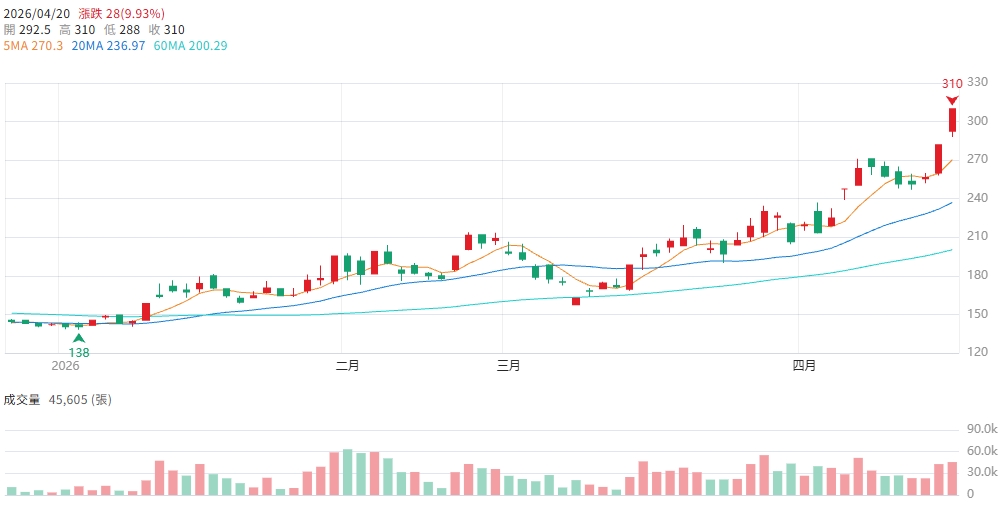 操作建議: 現有持股以282元(4/17收盤)為移動停利核心基準,守穩偏多持有;跌破282元視為主升波降溫,宜分批減碼。新資金不追310元漲停爆量,等量縮整理後觀察288至292.5元支撐區是否守穩,再評估低接時機;中長線以禮鼎上市進程與Q2月營收趨勢為主要追蹤指標。