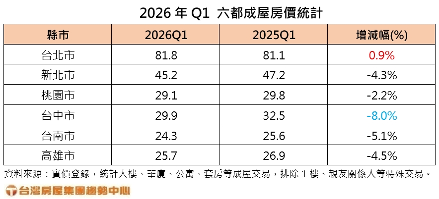 【理財周刊記者顏瓊真報導】房市真如央行所言「軟著陸」了?台灣房屋彙整實價登錄資料,統計今(2026)年Q1六都成屋交易均價和去年同期相較,台北市獨漲,Q1均價81.8萬元,較去年同期微增0.9%,其他以南各都均面臨4.5%跌幅的盤整,台中市從去年均價32.5萬,今年跌破三字頭,Q1均價約29.9萬元,年跌8%,跌幅居六都之冠。