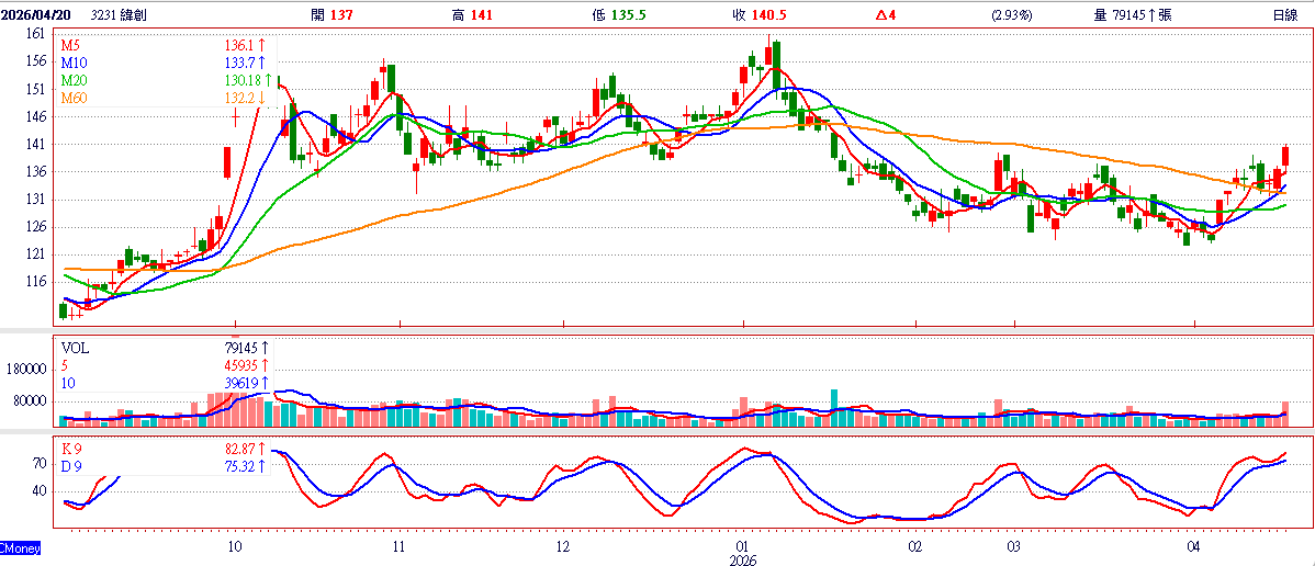 理周投研部表示,以緯創21日盤中股價143.5元計算,股已站上所有均線之上,且自5日線至月線乖離率在4.6%至9.3%的正常區間,顯示目前股價仍在合理範圍內,後續在業績題材與量能配合下,股價有機會進一步挑戰前波於1月13日盤中拉上147.5元高點,短線操作可於股價拉回時,尋找適當買點進場。