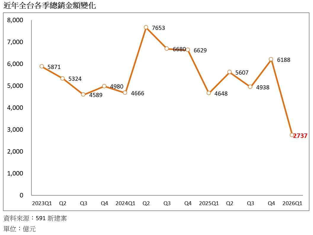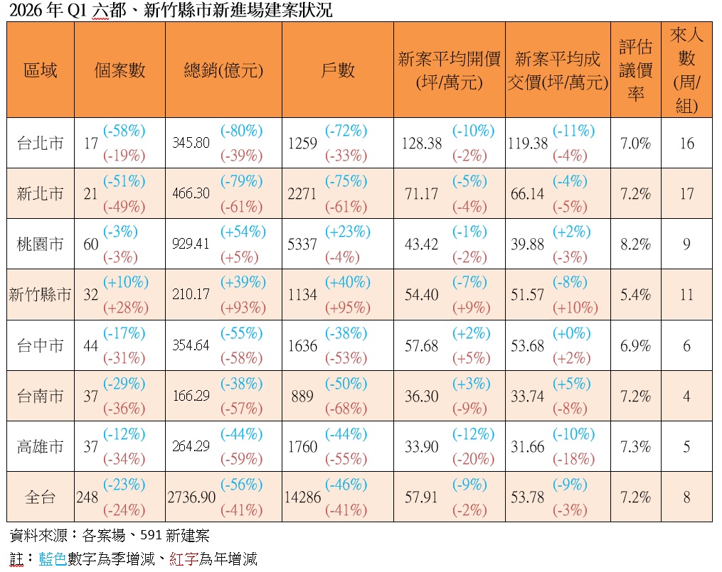 591新建案統計,全台六都及新竹第一季推案持續萎靡,進場建案共248件,戶數約1.43 萬戶,總銷金額為2,736.9億元,悉數創下單季歷史新低紀錄。