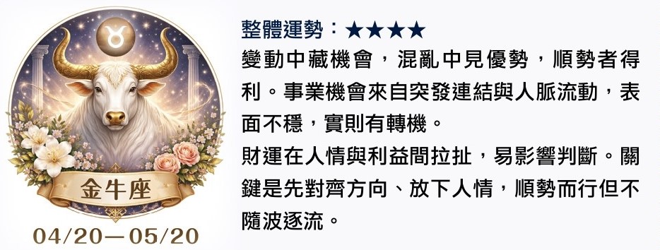 太陽進入金牛,本週適合推進計畫、重整財務與資源,調整收入結構,將想法落實為成果,同時優化產品與價值感,建立穩定累積。經濟、藝術創作、精品、房地產、園藝與餐飲等領域值得關注。