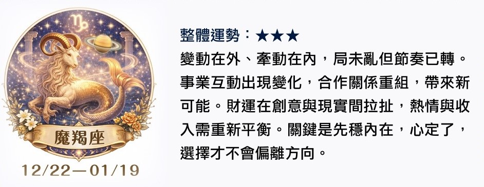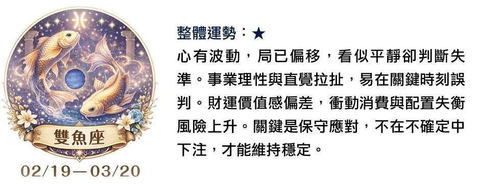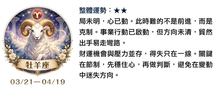 牡羊能量強勢,水星、火星、土星與海王星放大思考與行動,並與木星形成張力,使節奏加快,也提高誤判風險。容易在未看清局勢前急於行動,出現過度樂觀或資源失衡。此時關鍵不在速度,而在判斷精準度。