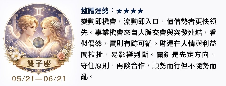 今年4月26日,天王星正式進入雙子座,象徵能量由內轉外,變革正式加速。自去年起天王星前後在金牛和雙子間的擺盪已顯現前兆:AI快速演進、能源議題升溫、政治與社會變動頻繁,世界進入高頻且難預測的狀態。未來七年「教育、資訊、交通、溝通與認知系統」,將在劇烈變動中完成結構性創新與升級。