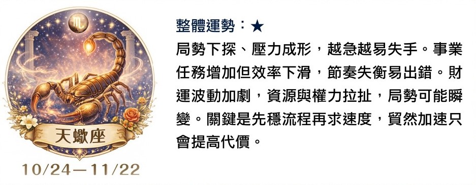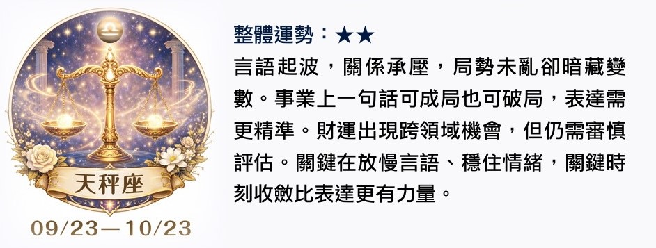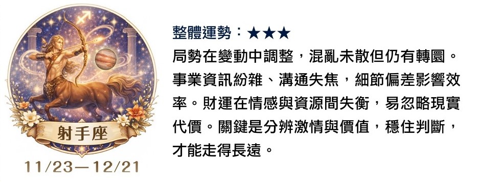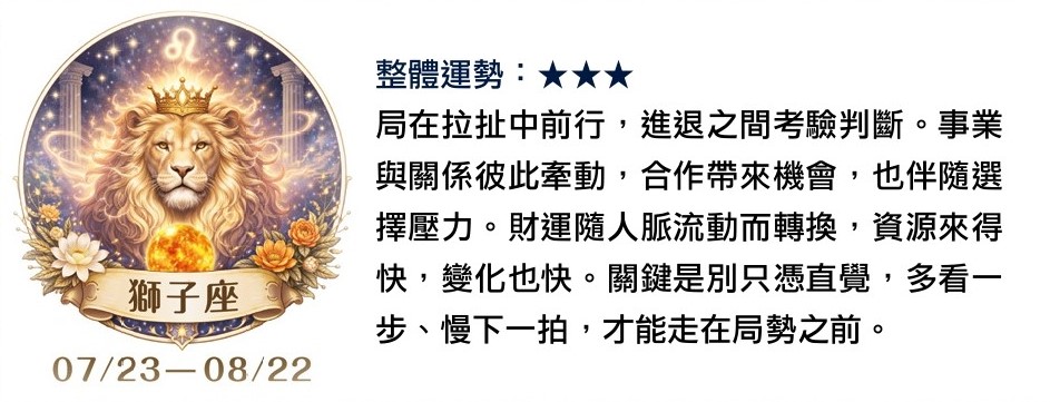 從能量來看,風象與火象交織運作。風象代表資訊、思維與傳播,帶來觀點革新;火象象徵行動與推進,使想法快速落地並擴散。整體節奏加快,變動與創新同步放大。