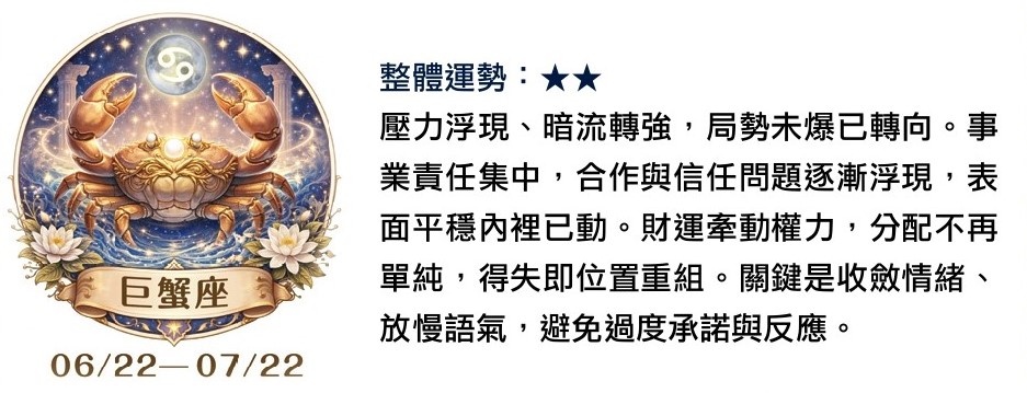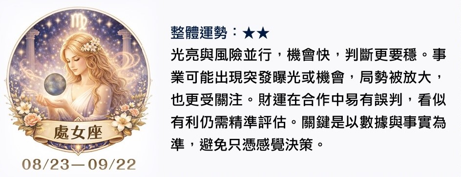 七月開始王星雙子與水瓶座冥王星形成三合,並與牡羊海王星構成小三角,開啟一段具推進力的結構性變革週期,且將出現三次啟動。這並非典型暴利格局,而是帶有隱性紅利的長期累積機會,讓看懂局勢的人穩定擴大優勢。