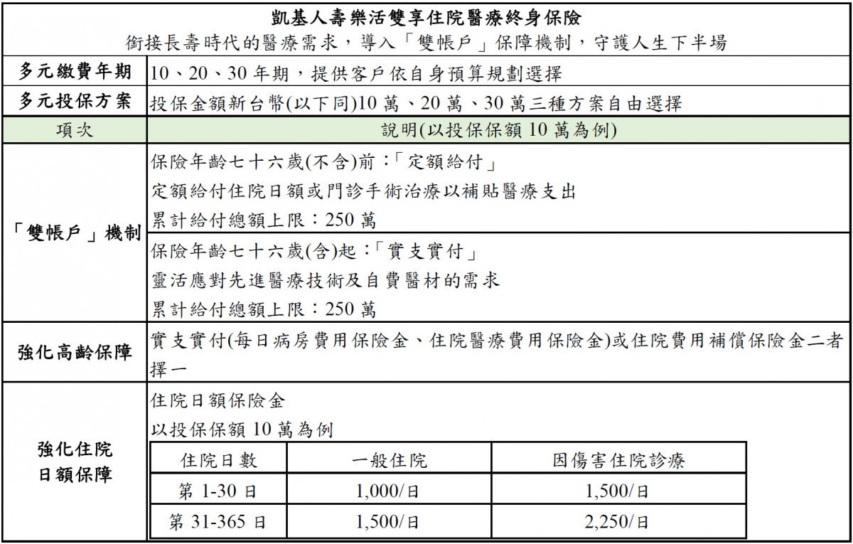 台灣已正式邁入超高齡社會,醫療科技的進步讓國人平均壽命延長,然而先進醫療技術與自費醫材的費用,同步衝擊長壽時代的財務壓力。而多數民眾投保的實支實付醫療險,保障年齡大多到75或80歲,當保障終止後,反而出現最需要醫療資源的空窗期。凱基人壽為協助民眾銜接長壽時代的醫療需求,推出「凱基人壽樂活雙享住院醫療終身保險」(以下簡稱「樂活雙享」),導入「雙帳戶」保障機制,以76歲作為分界點:76歲(不含)前,採「定額給付」模式,定額給付住院日額或門診手術治療以補貼醫療支出;當步入76歲(含)起至保險年齡到達96歲之保單週年日仍生存的高齡期,則改採「實支實付」機制,靈活應對先進醫療技術及自費醫材的需求,守護人生下半場。