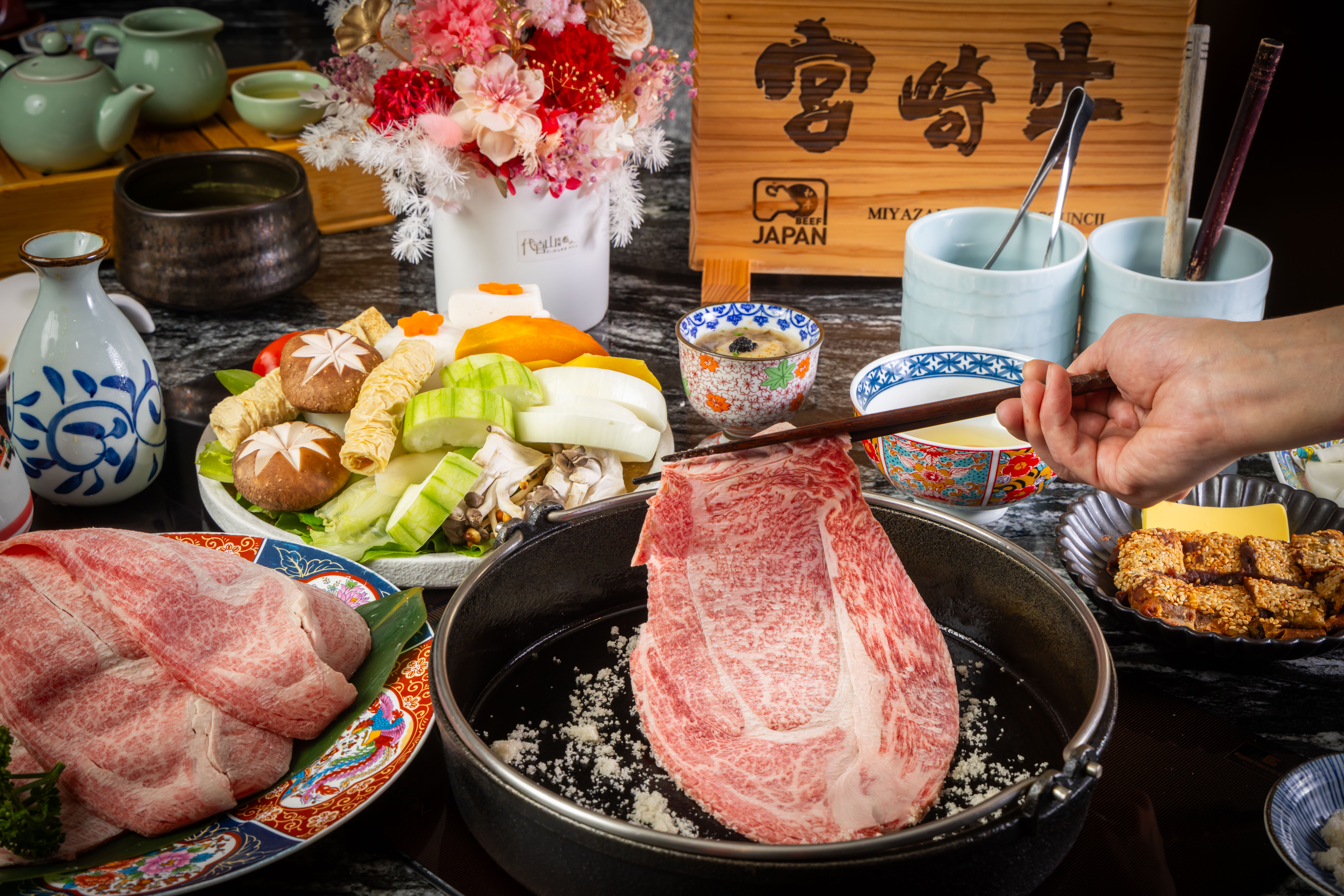 「橋山·壽喜燒專門店」以一席溫潤細膩的和牛饗宴,將難以言說的情感化為餐桌的深情告白。以日本A5和牛為主軸,推出招牌「松」單人套餐,每套4380元+10%,嚴選宮崎和牛肋眼入饌,全程專人桌邊服務,從熱鍋抹油、細火炒糖開始,一次品嚐兩種壽喜燒韻味。關西風以糖香引出肉質甘甜,經煎製釋放濃郁油脂香氣;關東風則以講究比例的醬汁細火慢煮,讓風味更圓潤深長。即日起點購「松」單人套餐,就送代官山花苑永生康乃馨一束。