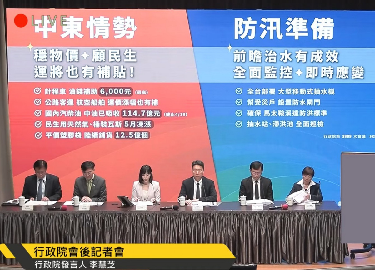 卓榮泰指出,目前國內石油仍維持安全存量,天然氣至6月也調度無虞,政府持續推動專案平穩機制,維持油價為亞鄰最低價;截至上週,中油公司預估已吸收114.7億元。同時,今日院會決定採取三項新措施,持續減輕產業負擔,照顧民生需求。