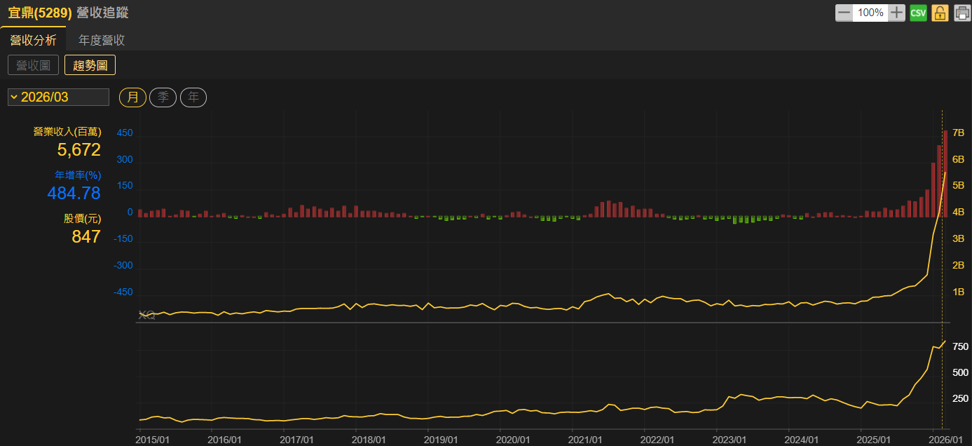 台灣工業用嵌入式儲存裝置(營收占比51.30%)&工業用動態隨機記憶體模組(營收占比38.83%)&AI邊緣運算解決方案(營收占比7.19%)專業廠宜鼎(5289),公布3月營收為56.72億元,月增率達35.75%,年增率高達484.78%,連續15個月年月雙增;累計今(2026)年1至3月營收總額為131.83億元,年增率亦高達403.39%。