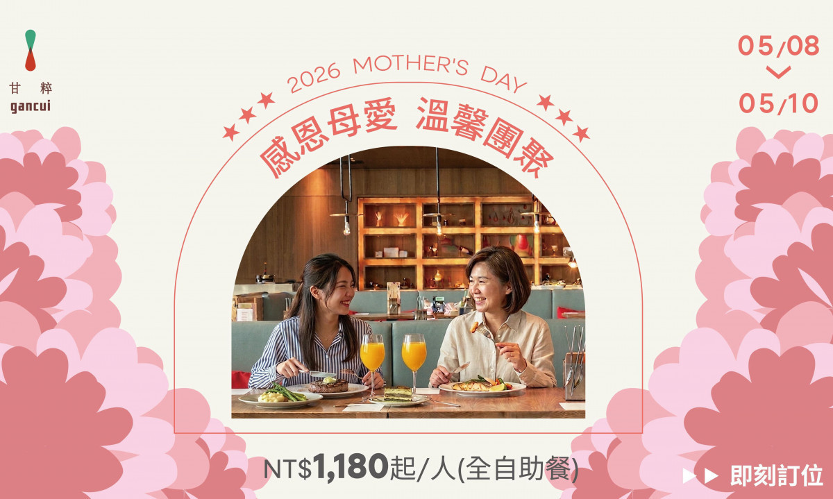 除了母親節週末主打的全自助餐外,甘粹餐廳於5月8日週五推出「半自助式晚餐」作為暖身場次,提供主菜搭配沙拉吧形式,方便無法於週末安排聚餐的民眾,也能提前慶祝母親節。無論選擇全自助或半自助形式,皆可於午餐11:00至14:00、晚餐17:30至21:00的用餐時段,享受甘粹餐廳精心準備的節慶款待。