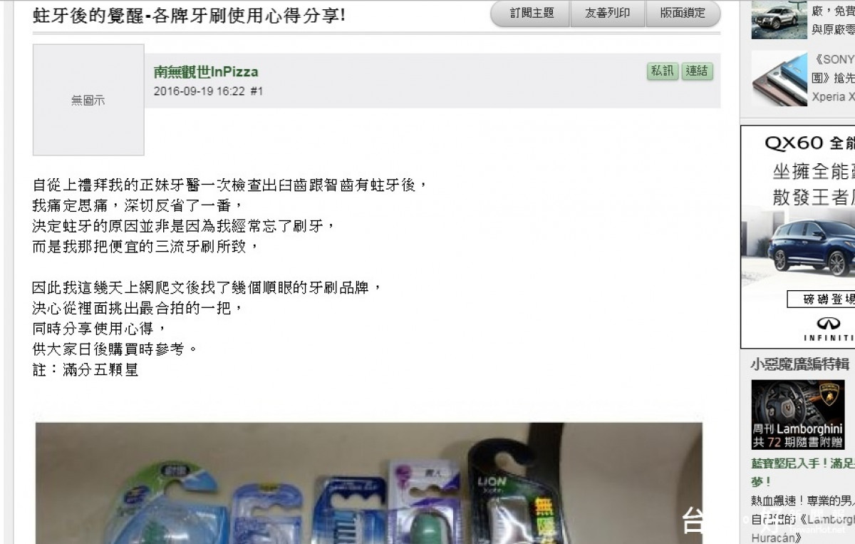 原PO在文中提到,自己前陣子因為牙痛被迫向牙醫師報到,檢查結果發現是臼齒和智齒蛀牙,且蛀牙的原因並非是因為他沒刷牙,而是因為使用不適合的牙刷所致。所以,他不只花了好幾天的時間爬文,還買了幾個品牌的牙刷回家試用,希望能從中挑出一把適合自己的,並將使用的心得PO上網給網友們參考。