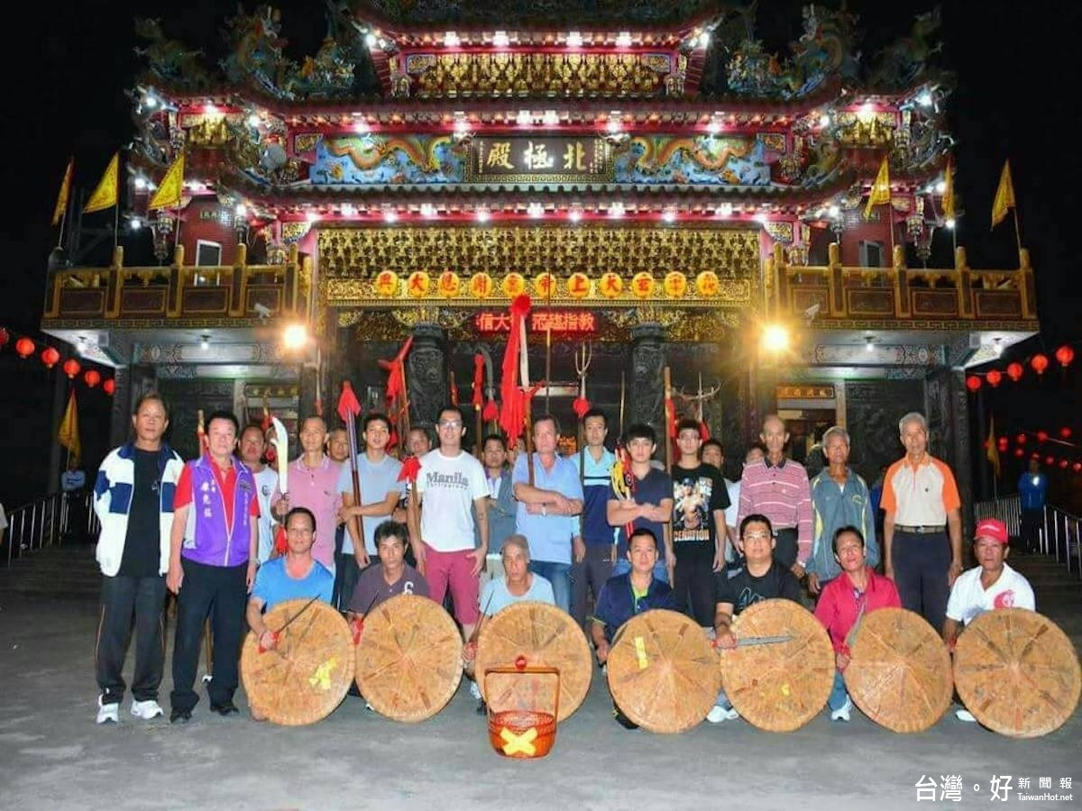 台南市新市區大社西興北極殿信眾訂12日吉時舉行「入廟安座」大典,屆時有玄天上帝等神明、神轎在宋江陣等文武陣頭護送,廟方執事者歡迎旅外鄉親回鄉和玄天上帝等諸神共沐神恩,宋陣隊員利用夜間加強操練,鄉親圍觀加油。27901宋江隊員夜間揮汗在大廟庭操兵,信眾前往加油打氣。