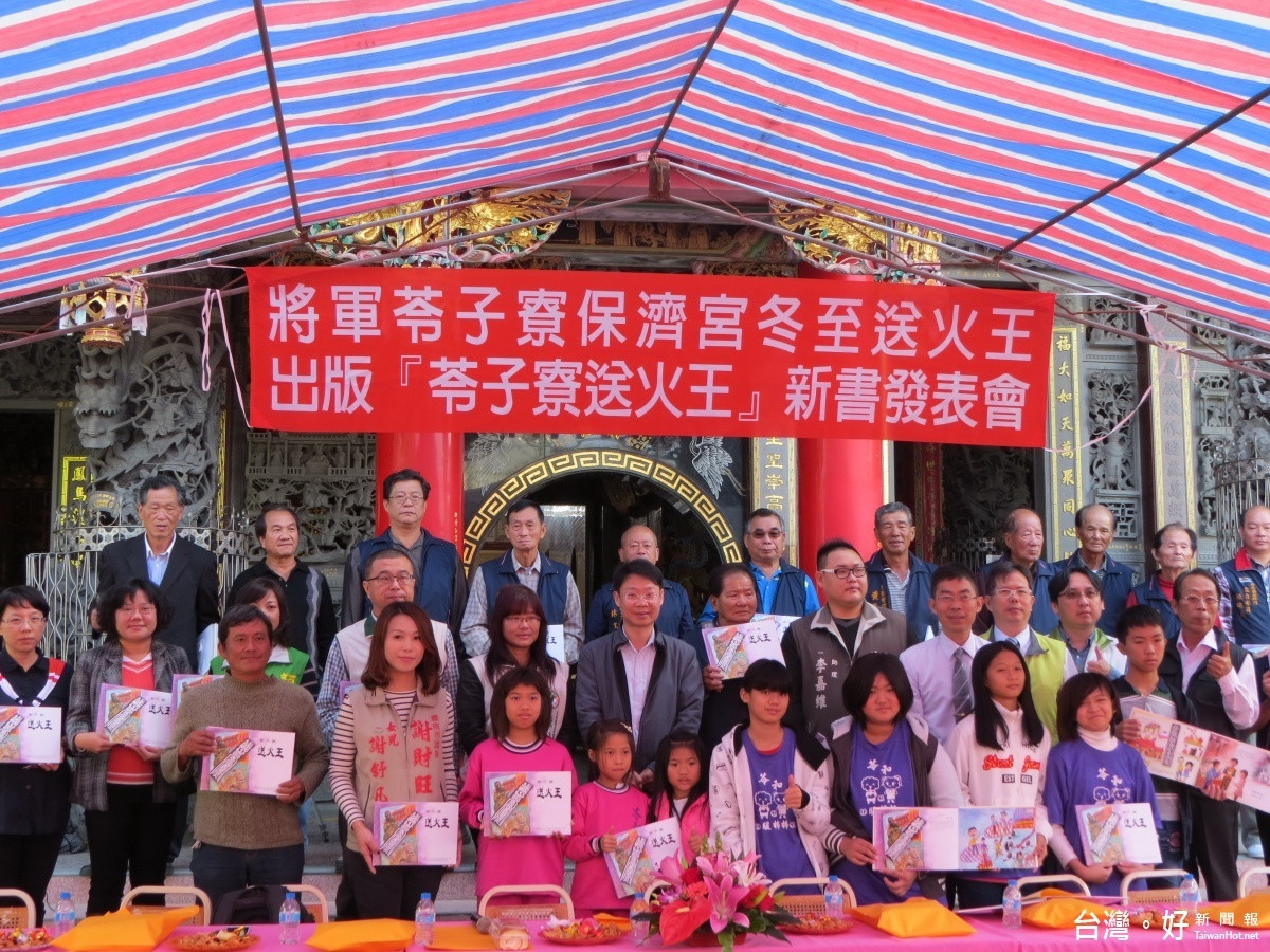 將軍區苓子寮保濟宮冬至前夕舉辦「送火王繪本」發表記者會上,與會人員展示新出版的「送火王繪本」。(記者邱仁武/攝)