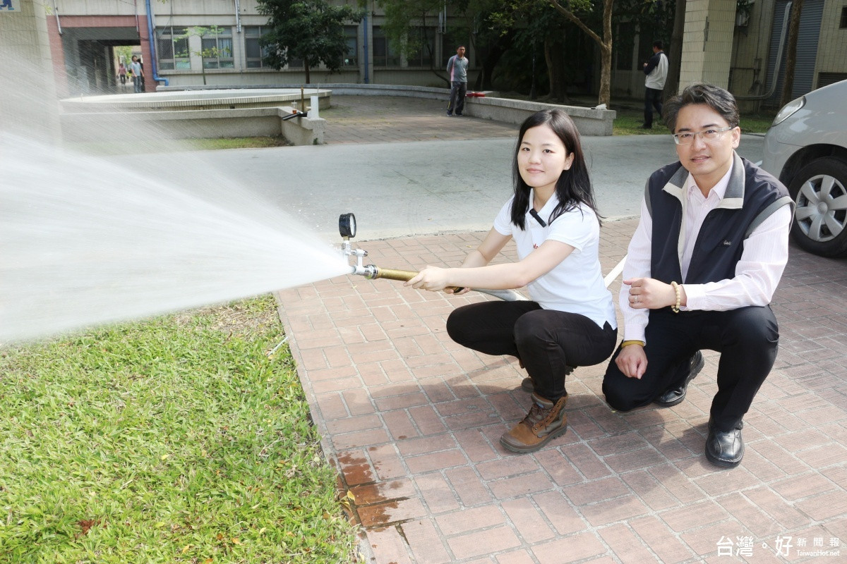 賴沛泠(左)量測消防水管水壓,雲嘉南分署長柯呈枋(右)肯定表現。