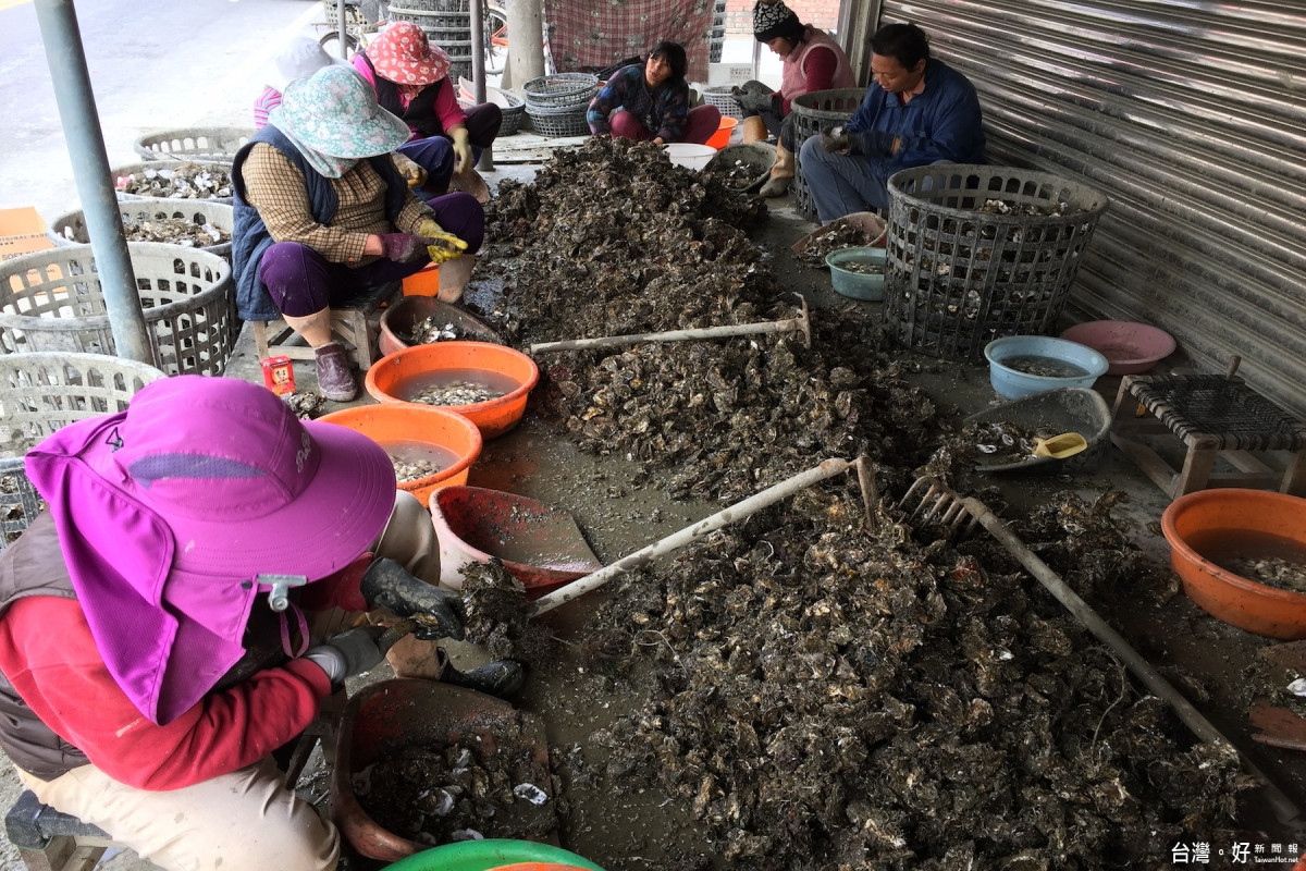 台南市七股區龍山漁村養在潟湖的鮮蚵出現一斤難求,蚵婦日夜加班剝蚵肉,除夕到大年初五市面一直沒有鮮蚵可賣窘況,即使盤商或是遊客加價購也無法如願,產量少,再加上春節期間漁港一帶炸蚵嗲攤販、海產店蚵仔麵線等業者需求量大,創下漁村結庄200多年來天價,每斤飆到220元以上。(記者/黃芳祿攝)